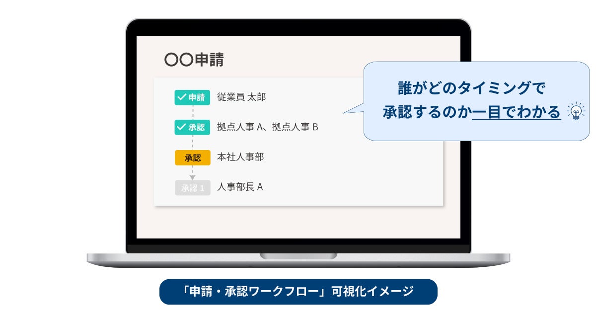 人事申請をはじめとした、社内のあらゆる手続きに関わる承認者や承認状況をリアルタイムで確認可能に