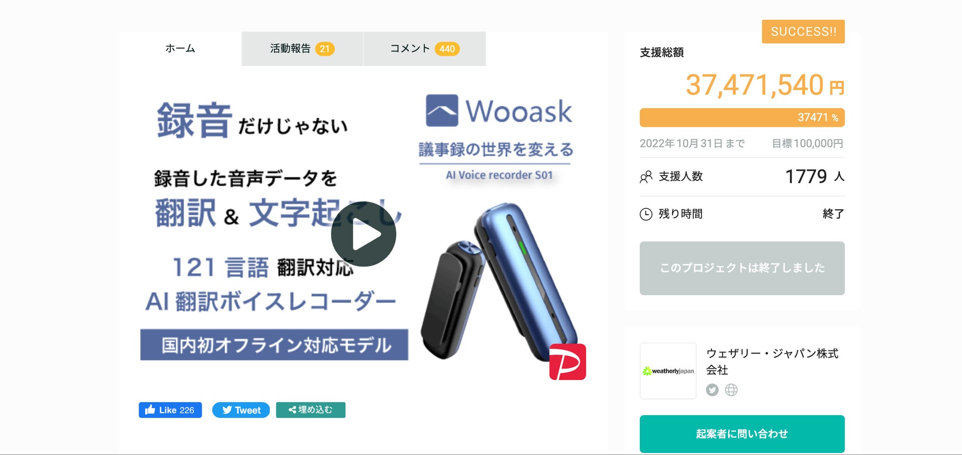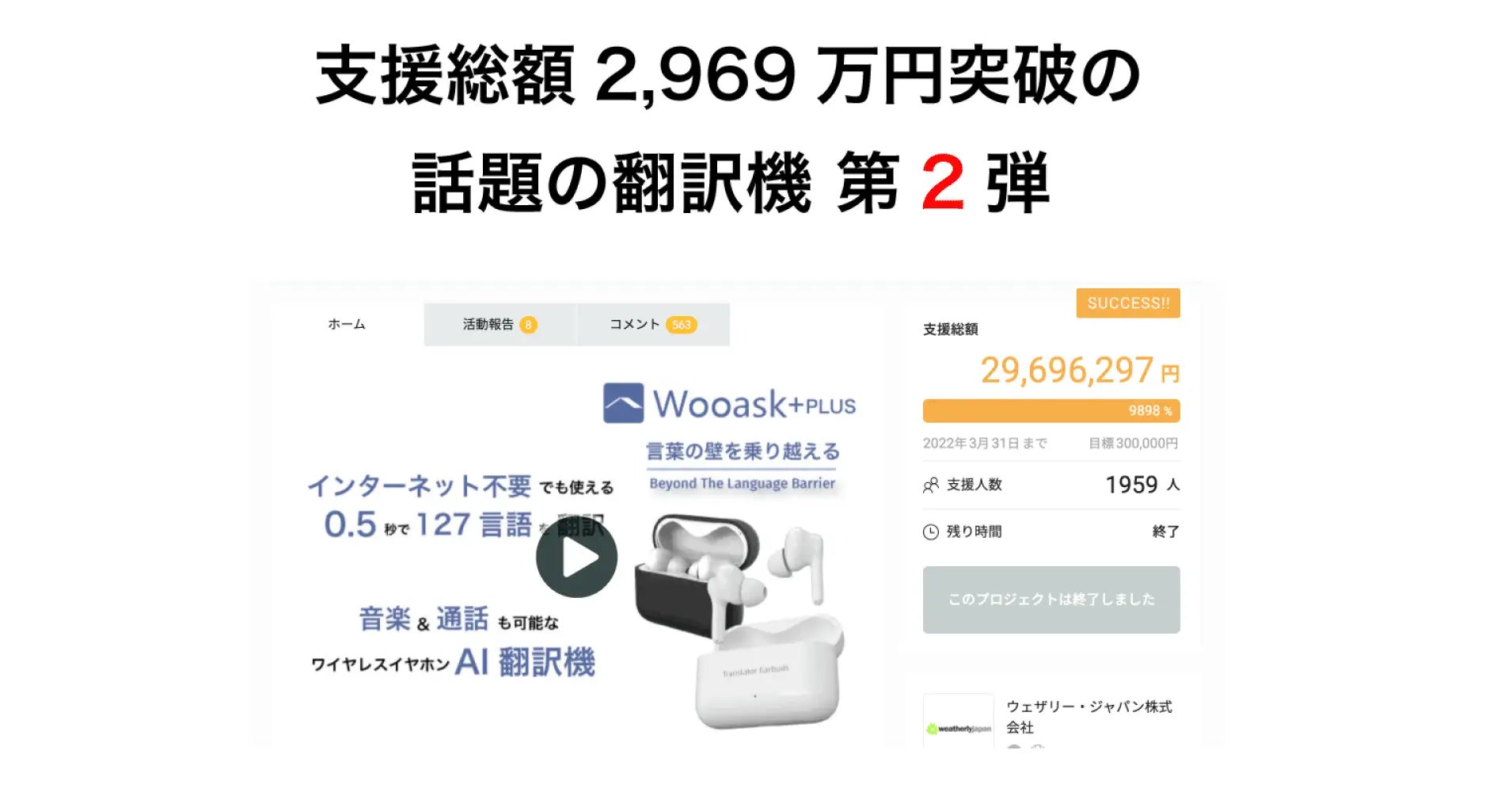 ウェザリー・ジャパン株式会社(本社:東京都新宿区)は、クラウドファンディングサイト「GREENFUNDING」にて3747万円の支援、また売上ランキング1位を頂いた AI翻訳ボイスレコーダーアップデート版『Wooask S01 PLUS(オン&オフライン対応モデル)』および、従来版『Wooask S01(オンライン対応モデル)』の一般通常販売を開始しております。