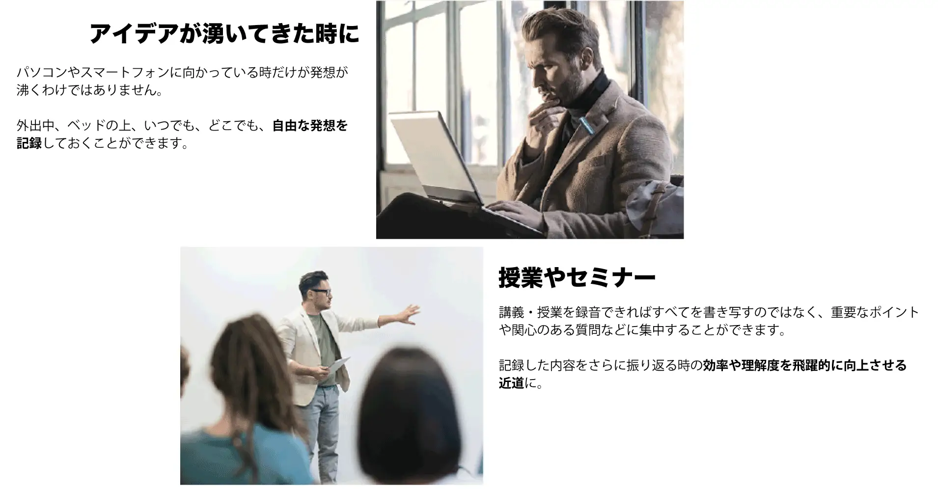 121言語対応のリアルタイム翻訳、Word&PDFへ書き出し可能なテキストデータへ即時変換。もう「書く」ことへの集中は不要です。議事録、インタビュー、アイデアメモも劇的に効率アップ。