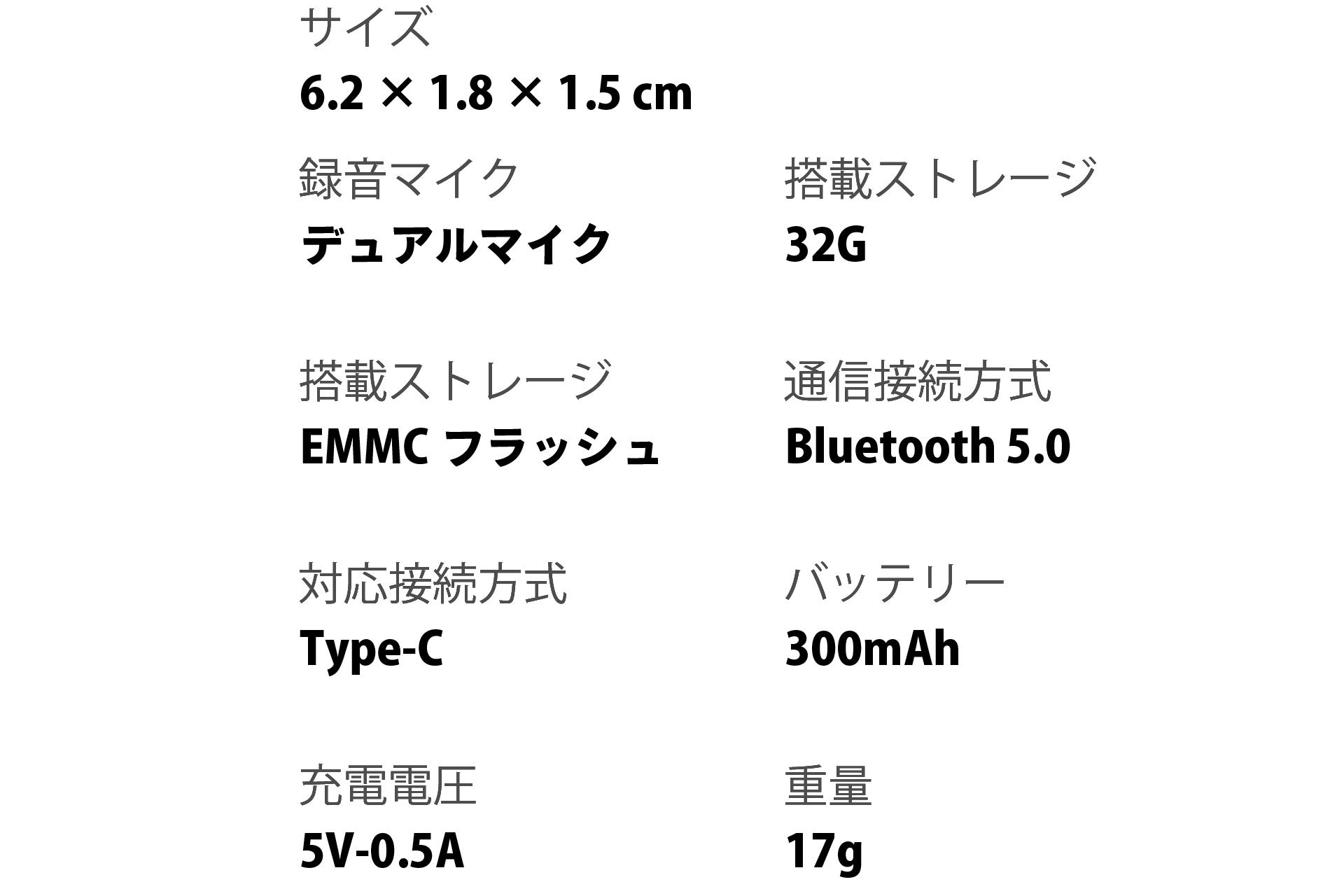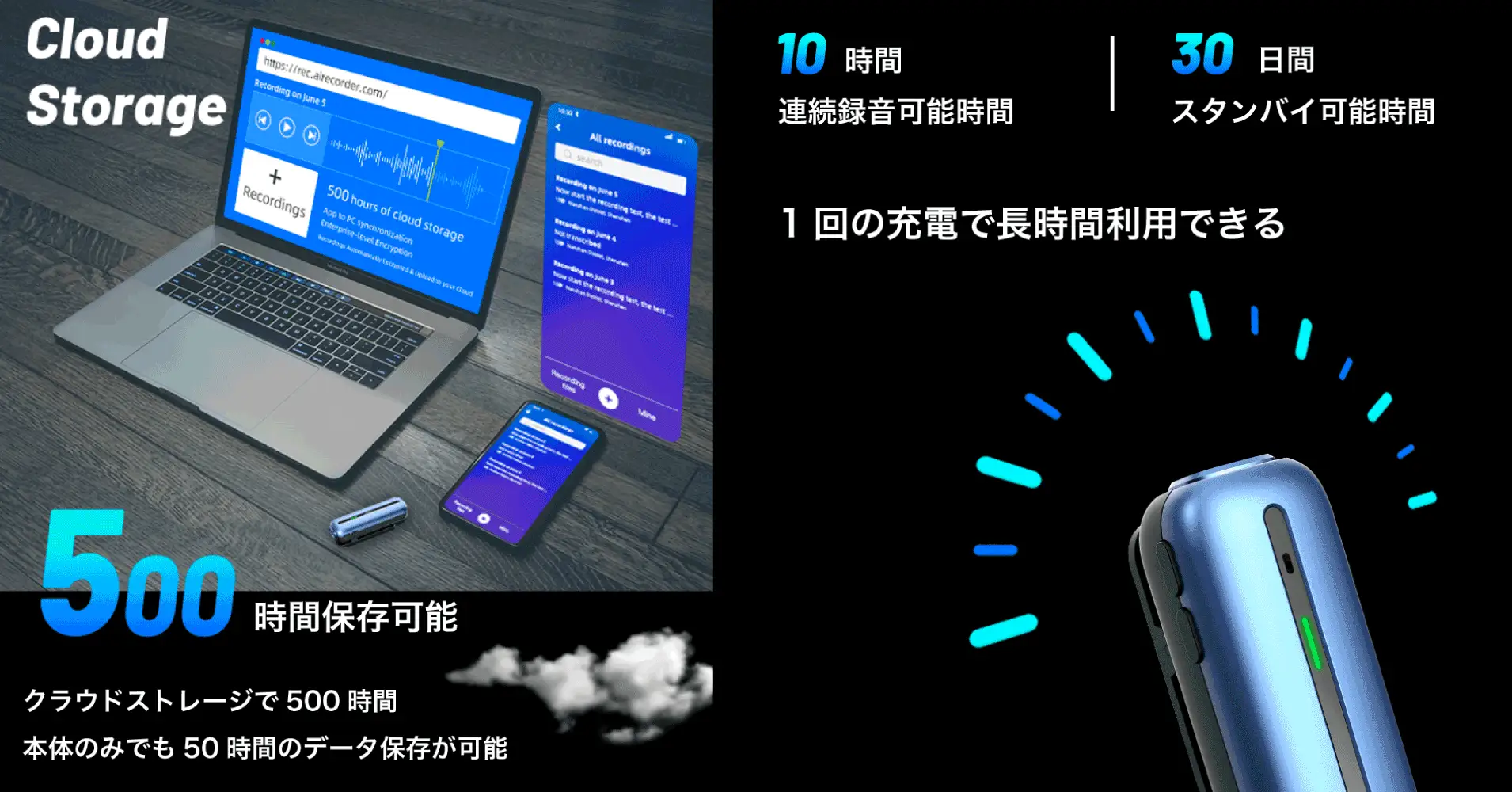 スタンバイ可能時間は最大で30日間。連続利用時間は10時間連続録音が可能。