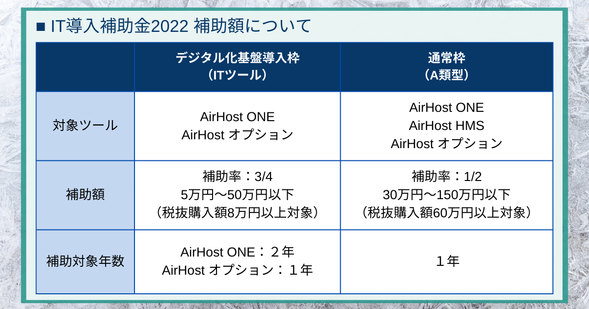 オールインワン型のホテルシステム「AirHost HMS 」に含まれるサイトコントローラ、PMS、ブッキングエンジン、その他のオプション機能等、エアホストを初めて導入される宿泊施設様を対象に、今年度のIT導入補助金を利用できます。