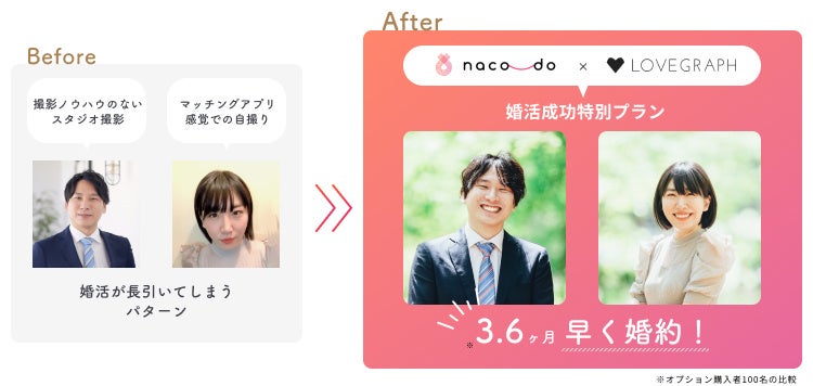 オンライン結婚相談所「naco-do」を運営する株式会社いろもの(本社:東京都渋谷区、代表取締役:山田陵、以下「いろもの」)は出張撮影サービス「Lovegraph(ラブグラフ)」を運営する株式会社ラブグラフ(本社:東京都渋谷区、代表取締役社長:駒下純兵、本間達也、以下ラブグラフ)と提携して、「naco-do」の会員向けにプロフィール写真の撮影オプションの提供を開始しました。