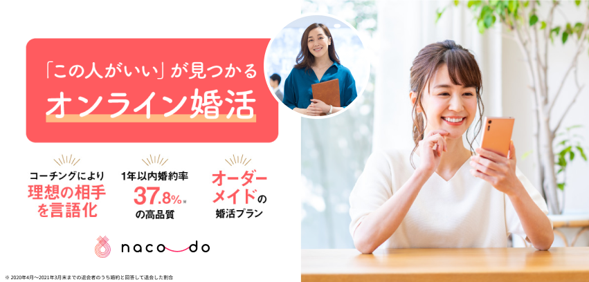 「naco-do」は、業界最大121,000人の会員数(*1)をもとにした出会いの提供だけでなく、独自のコーチングプログラムを修了した専属サポーターが出会いから結婚まで伴奏する婚活コーチングサービスを提供しています。100%独身証明書を取得している結婚したい独身同士が、サポートを受けながら結婚を目指せるため、アプリでの婚活と比較しても高い、1年以内の婚約率37.8%のサービス(*2)です。