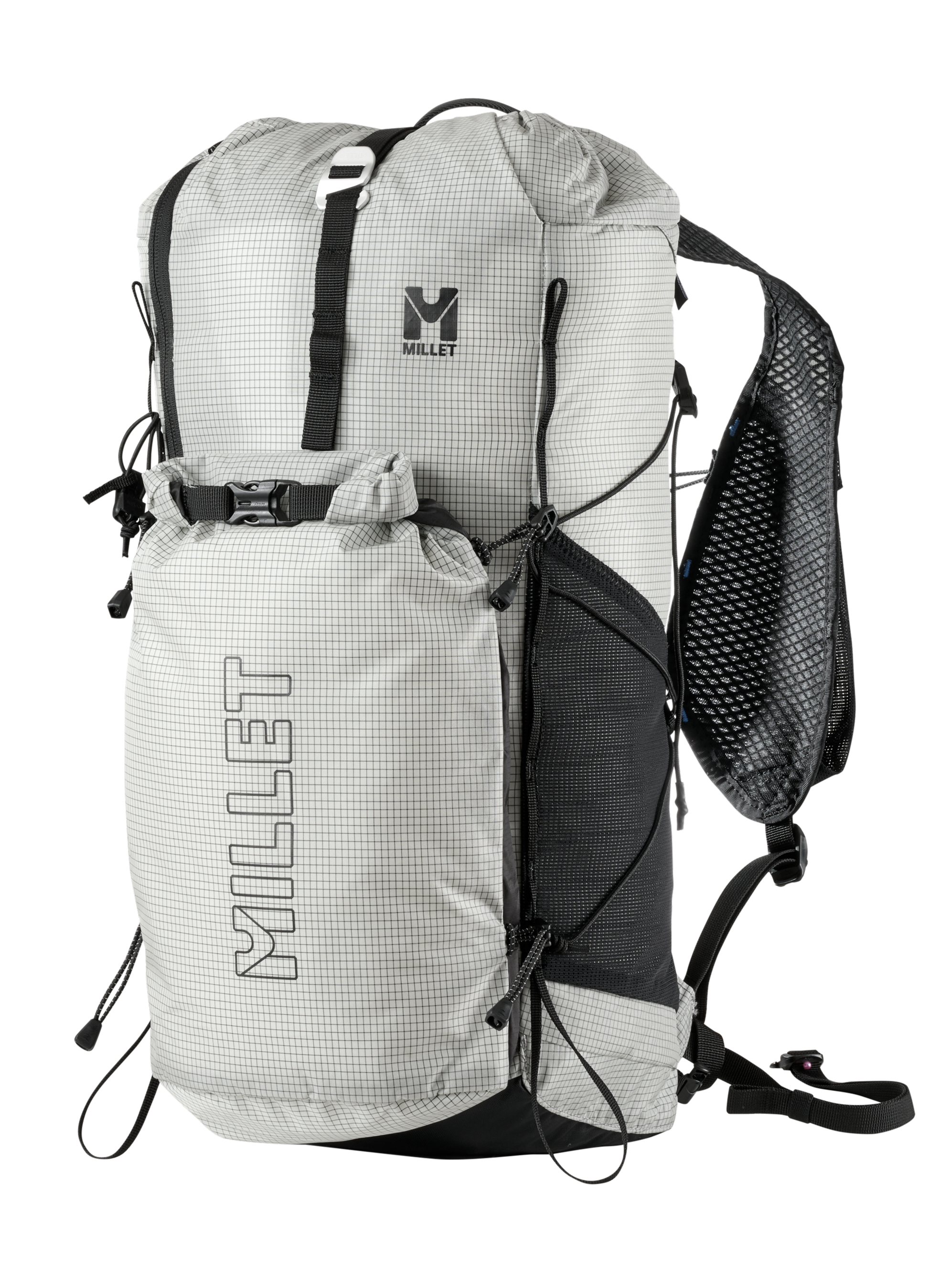 高強度リップストップナイロンにより、軽さと耐引裂き強度を両立しています。Xフレームと3Dメッシュバックパネルが荷重を安定させ、長時間の行動でも快適な背負い心地を実現。ロールトップ構造や脱着式リバーシブルポケットにより、装備量の多い行動にも対応します。