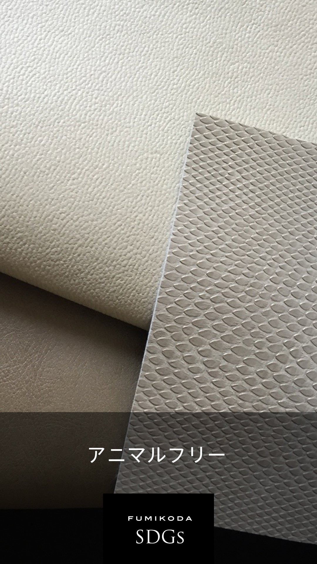 FUMIKODA(フミコダ)の商品は、動物性素材を使用せず、動物皮革の構造を人工的に再現した日本製のヴィーガンレザー(人工皮革)を使用しています。ラグジュアリー感がありながら本革よりも軽く、耐水性・耐久性が高いため、高級車の内装にも採用されています。
