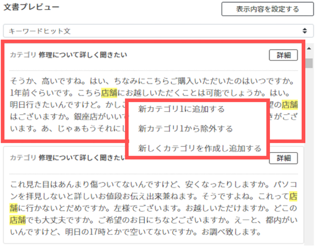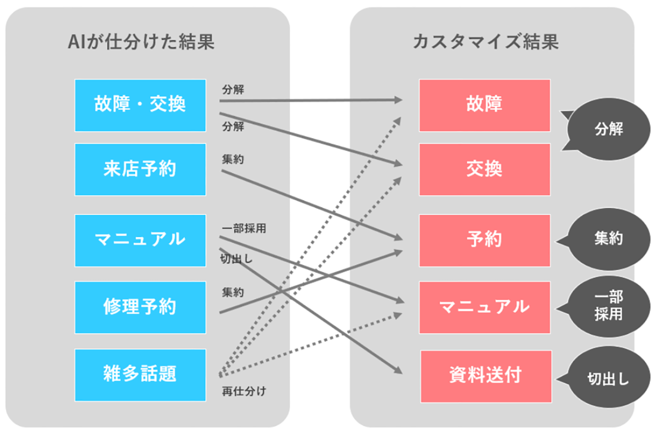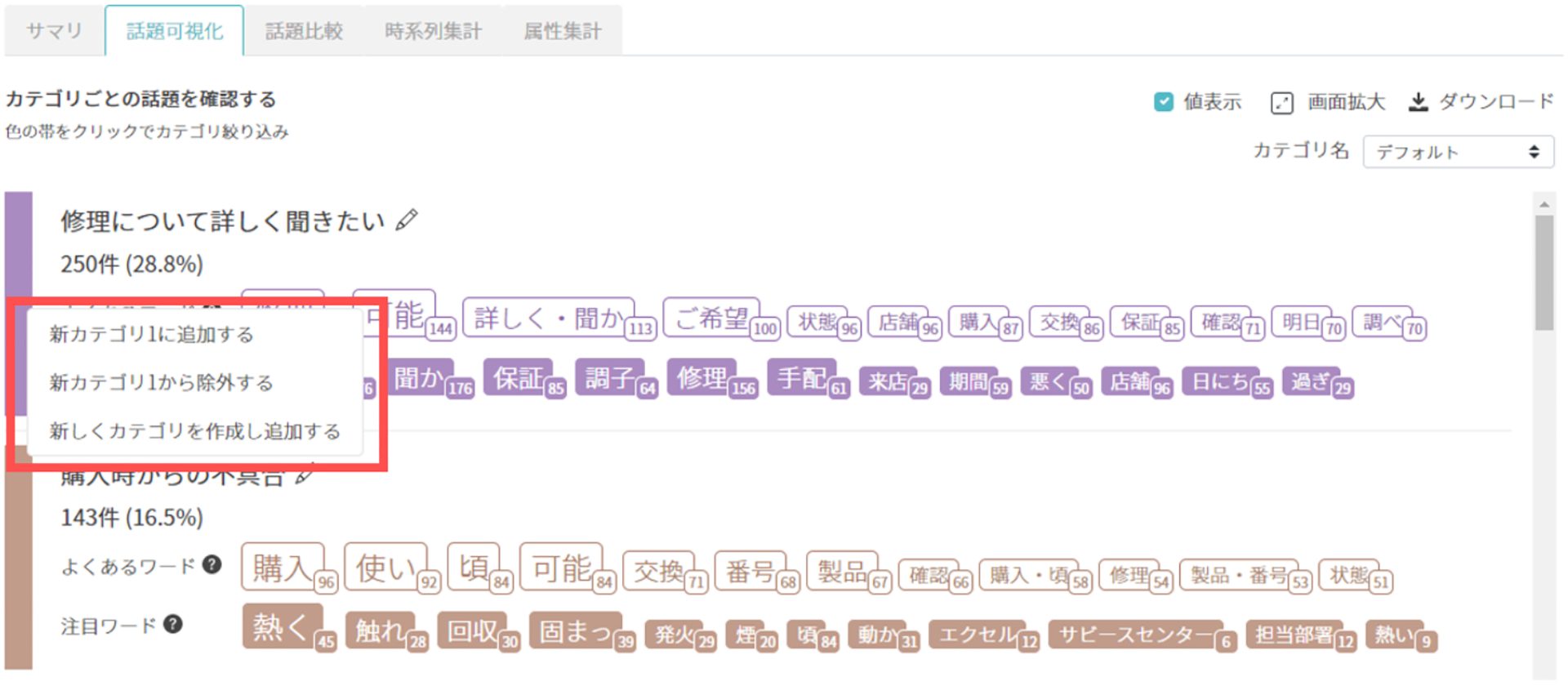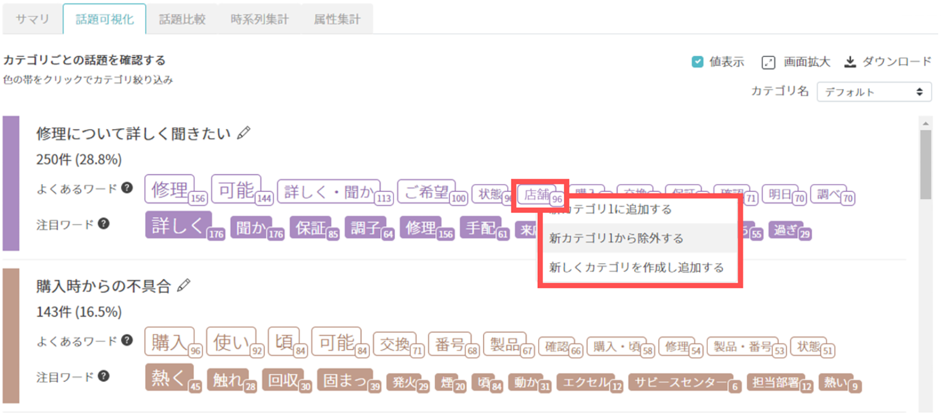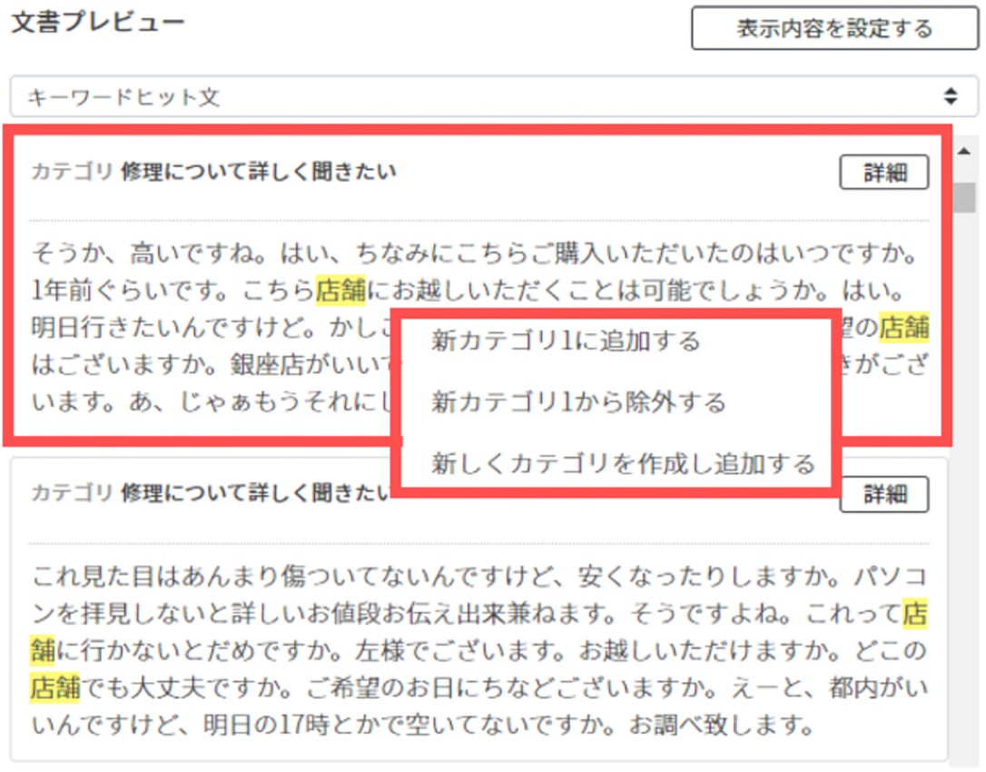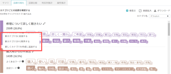 AIによる分類結果をそのまま採用することも、一部の単語のみを採用し、新たな分類項目を作ることも可能です。また一部関係のない情報が混ざっていた際は単語・文章単位で除外することができます。