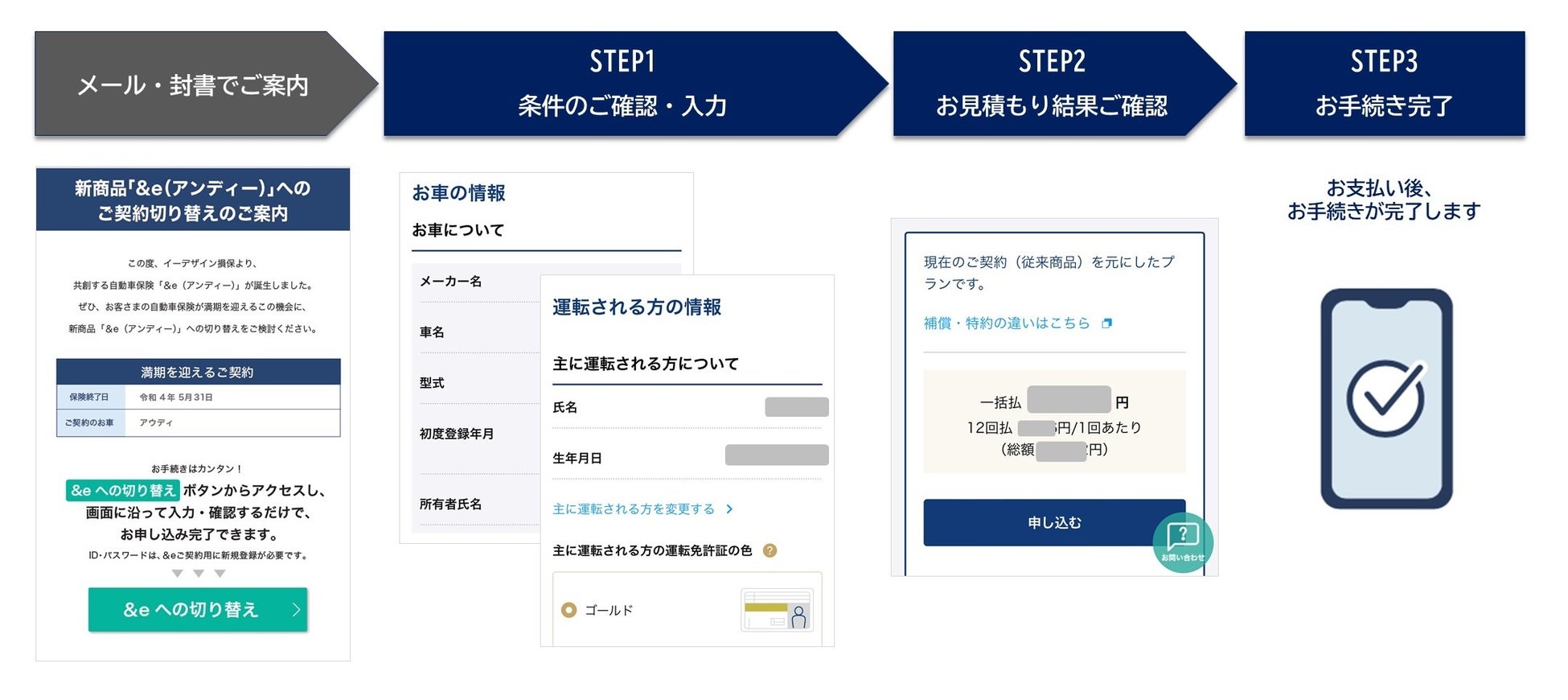 従来商品にご契約中のお客さまが、スムーズに&eに切り替えいただけるよう、契約手続きの改善を行いました。本手続きのご案内は現在のご契約の満期日が2022年7月1日(金)以降のご契約が対象です。