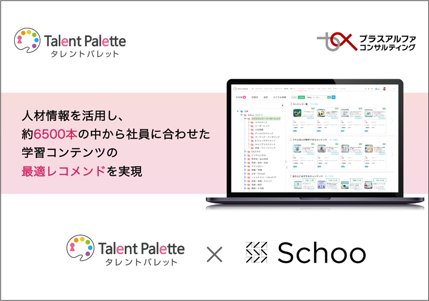 株式会社プラスアルファ・コンサルティング(本社:東京都港区、代表取締役社長:三室克哉)はデータに基づいた人事戦略の実現を目指すタレントマネジメントシステム「Talent Palette(タレントパレット)」において、株式会社Schoo(本社:東京都渋谷区、代表取締役社長:森 健志郎、以下「スクー」)が提供するオンライン研修サービス「Schoo for Business」との連携を開始します。