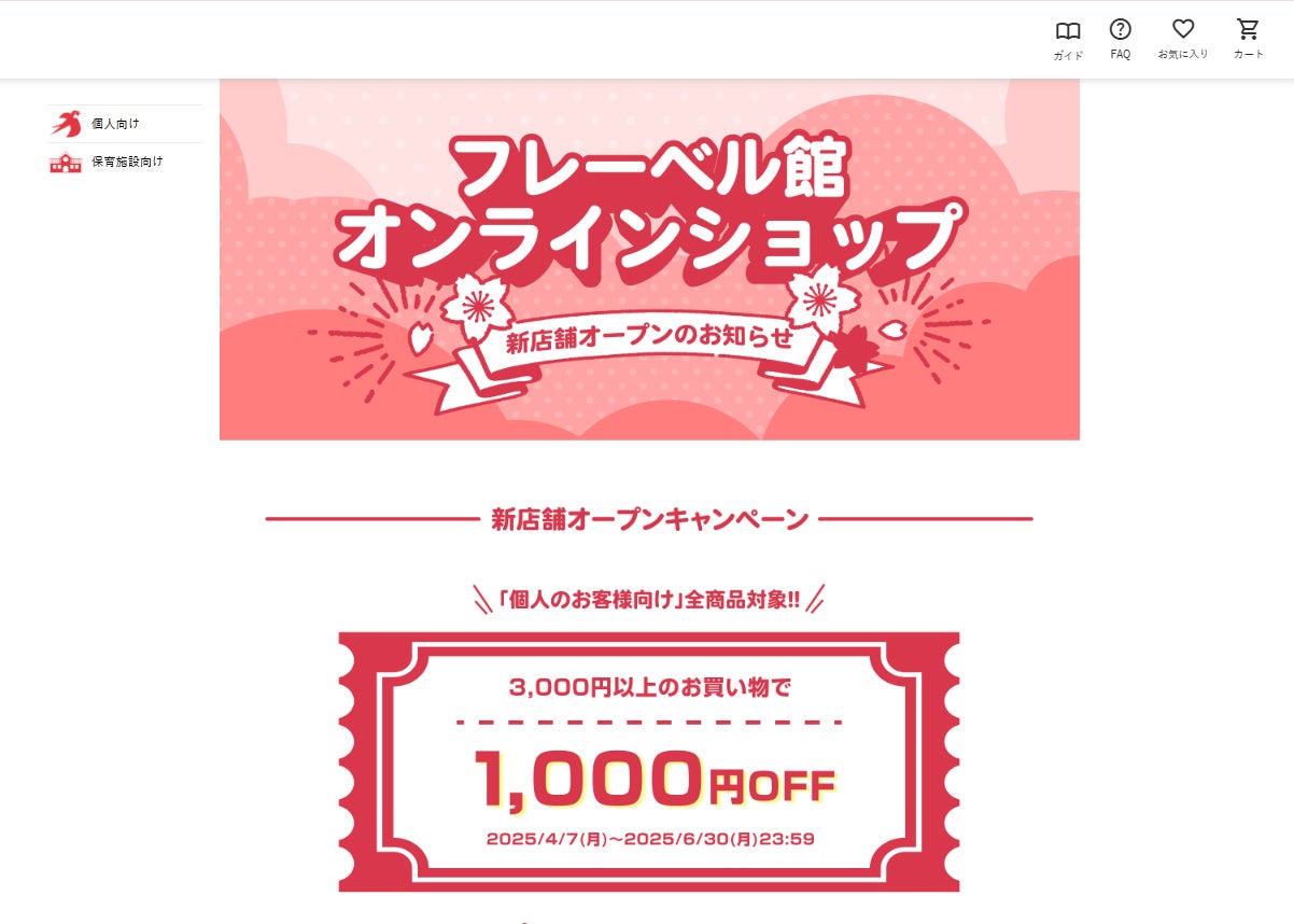 フレーベル館では、販促活動を通じた売上アップの一環として、オンラインショップの新店舗オープンキャンペーンを実施しています。このキャンペーンでは、メルカートの標準機能であるクーポン機能を活用し、顧客へお得なサービス提供することで販促活動を活性化させています。