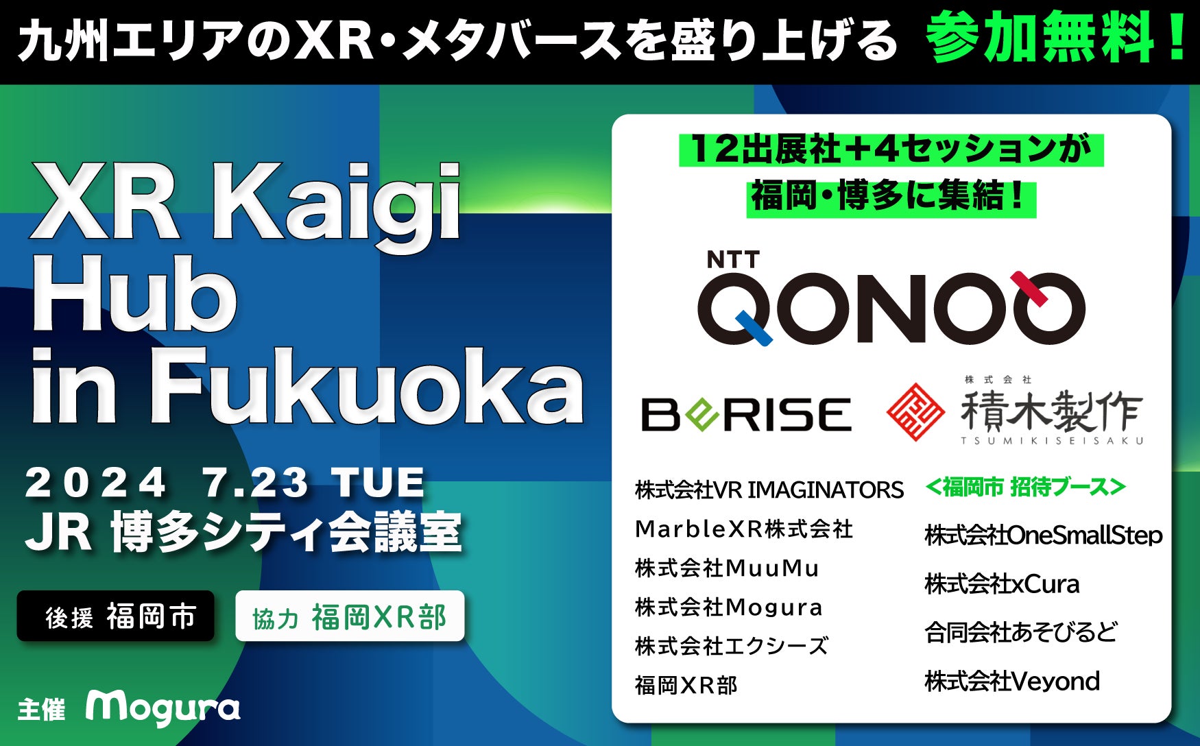 株式会社Moguraは、国内随一のXR・メタバース業界カンファレンス「XR Kaigi」の姉妹イベント「XR Kaigi Hub in 福岡」の出展社及びセッションの詳細・スピーカー情報を発表いたしました。