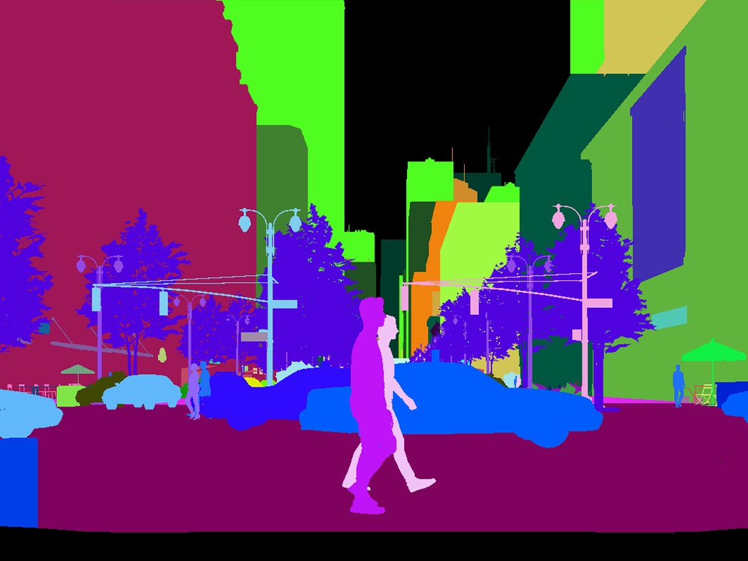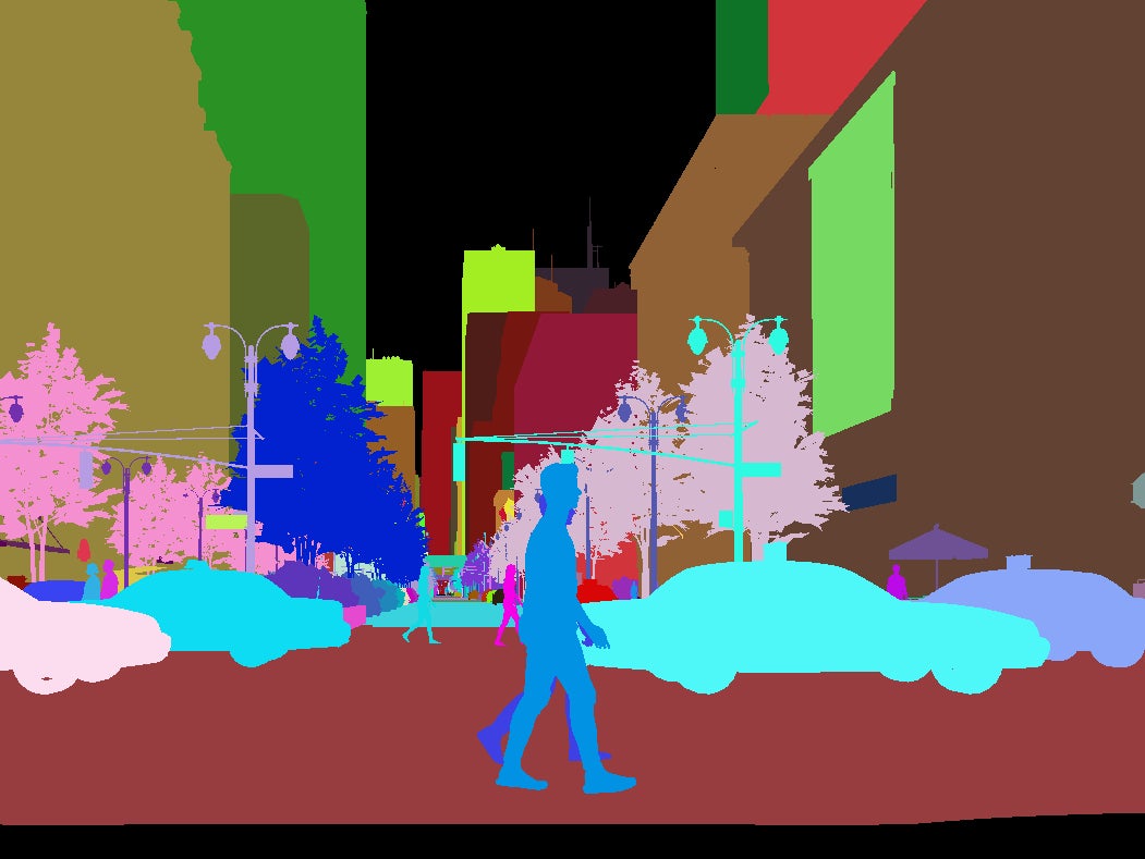 仮想空間内のオブジェクトをクラス(CS)毎、インスタンス(IS)毎に色分けされた画像セグメンテーションとしてPNG出力が可能。