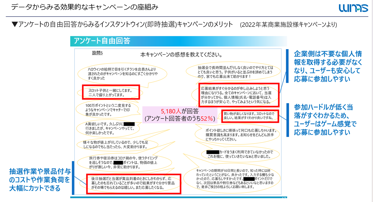 ▼インスタントウィン(その場で当たる)キャンペーンのニーズが高まっており、キャンペーン参加者のアンケート(※自由回答)からもメリットが読み取れる