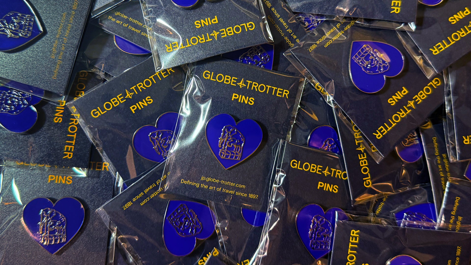 グローブ・トロッターでは父の日キャンペーンの期間中、グローブ・トロッター各直営店舗にて60,000円(税込)以上お買い上げのお客様に、エレファント・ジョン ハートチャームをモチーフとしたオリジナルピンバッジを先着順にてプレゼントいたします。