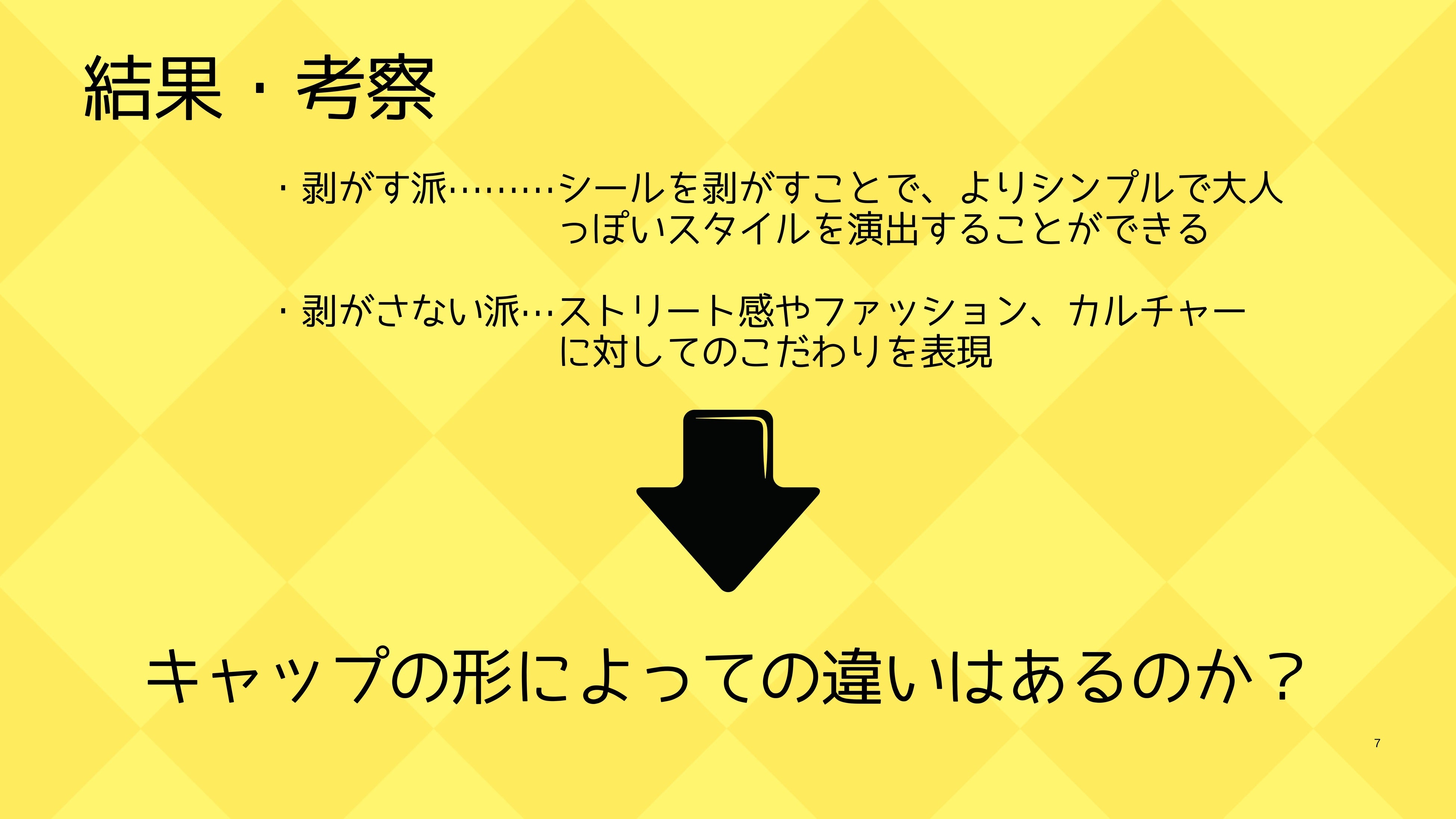 キャップのシールを剥がすか剥がさないか。服飾学生が休憩時間に繰り広げていそうな論争のテーマに「らしさ」を感じるとともに、それを数値的に解明しようとする取り組みがとても面白いと思います。