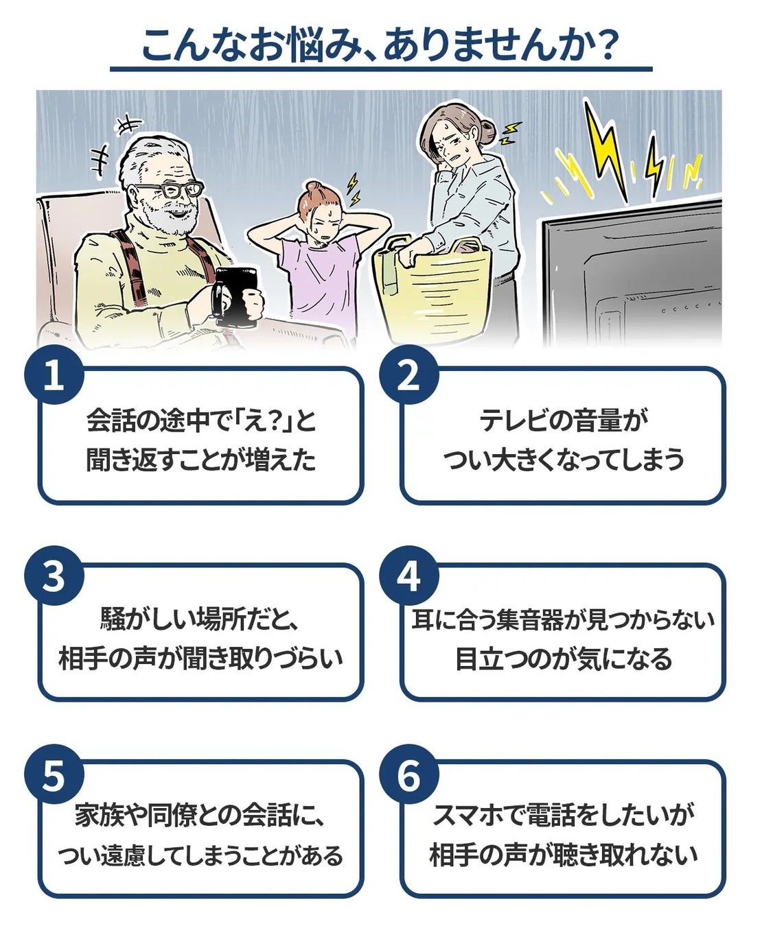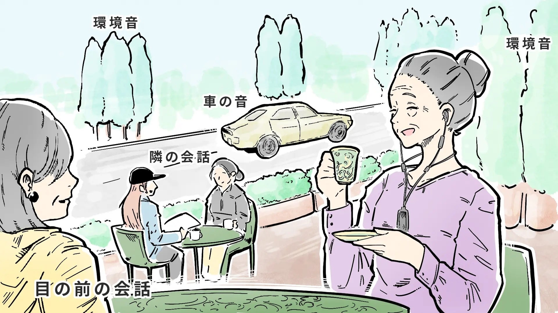 従来の集音器の課題であったハウリング(ピーピー音)やノイズ(紙擦れ音、風切り音など)をAI技術で抑制し、騒がしい場所でもクリアな会話を可能にすることで、ユーザーが「聞き返す」ストレスをなくし、より自然で快適な「聞こえ」を提供します 。テレビの音量を上げずに楽しめるなど、日常生活の様々なシーンでの快適さを追求しています 。