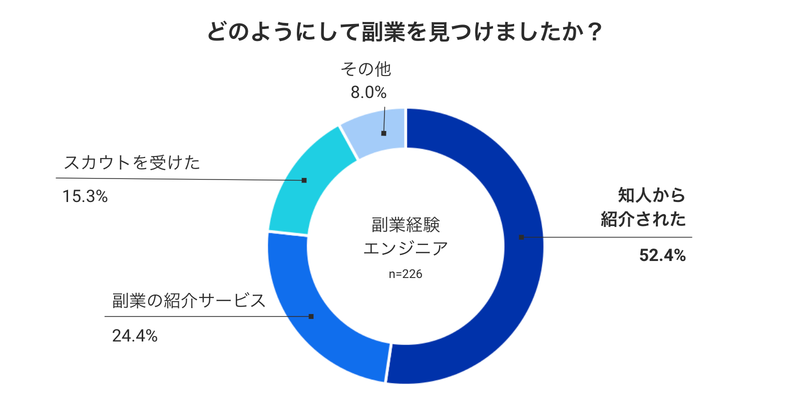 副業をどのようにして見つけているかを聞いたところ、知人からの紹介が約半数となりました。知人からの紹介が主な副業紹介ルートであることがわかりました。