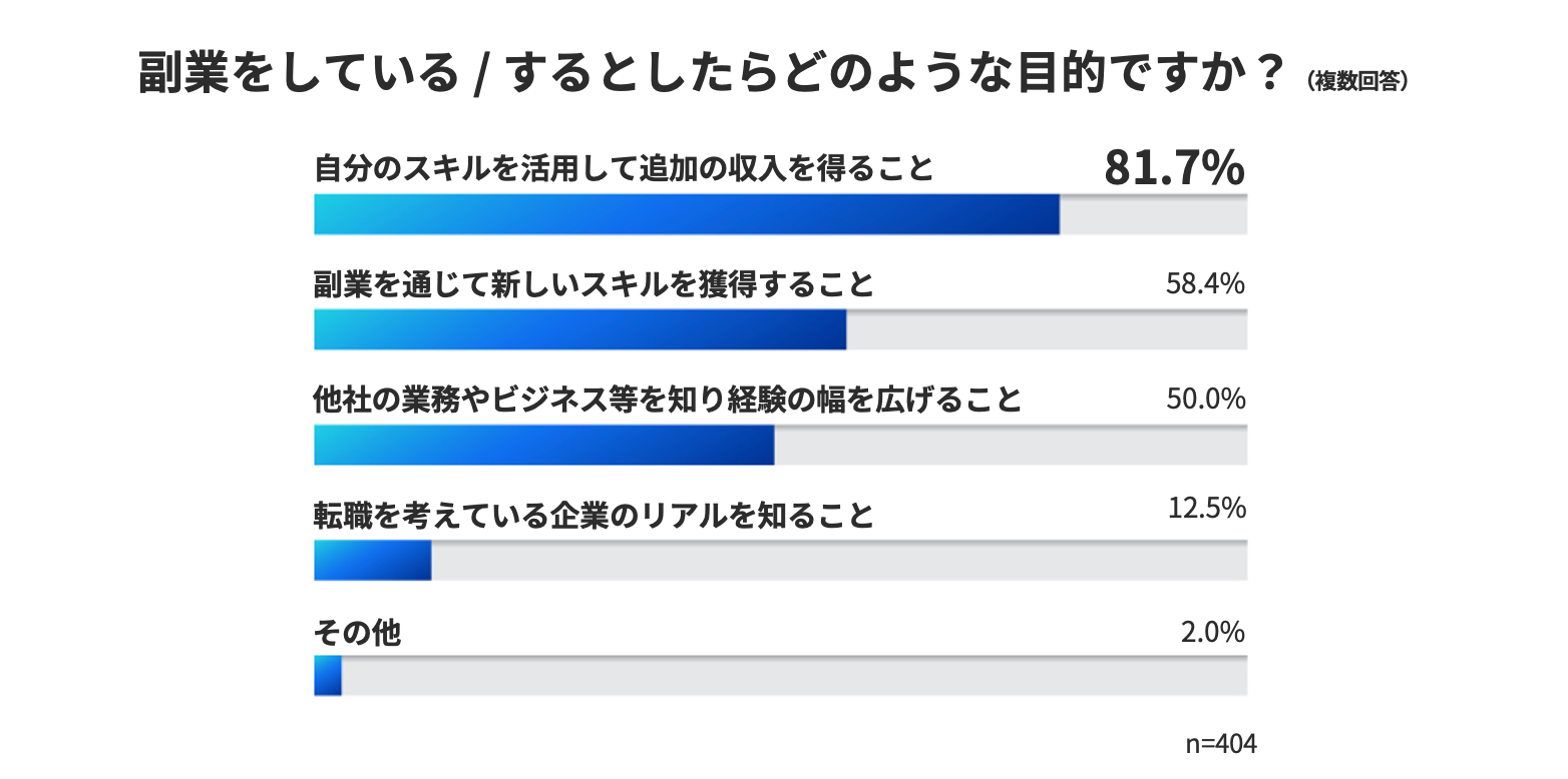 また、副業がスキルの習得の機会ということだけでなく、一部の方にとっては次の転職先候補の実態把握の目的もあることが今回わかりました。副業時の体験が転職の意志決定のファクターになっていくことも今後は増えてくるのではないかと考えています。
