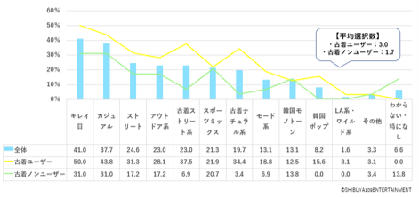 男女別に日常的に着ているファッションジャンル※図1・2について聞いたところ、古着ユーザーとノンユーザーの違いが明らかとなりました。男性の場合※図1、古着ユーザーも古着ノンユーザーも「キレイ目」「カジュアル」がTOP2となりましたが、古着ユーザーは平均3.0個のファッションジャンルを選択する一方で、古着ノンユーザーは平均1.7個選択しており、古着ユーザーはより多くのファッションジャンルを楽しむ中で、「古着」も楽しんでいることがわかりました。