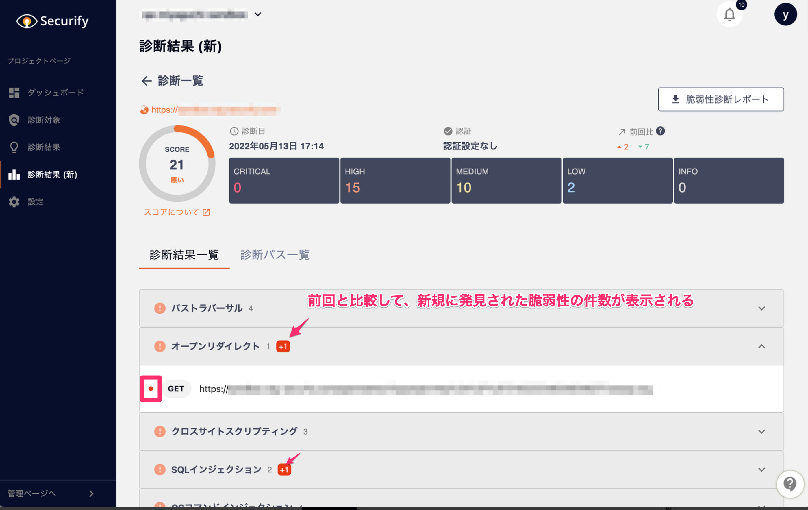 前回と比較して、新規に発見された件数、減少した件数が表示されます。