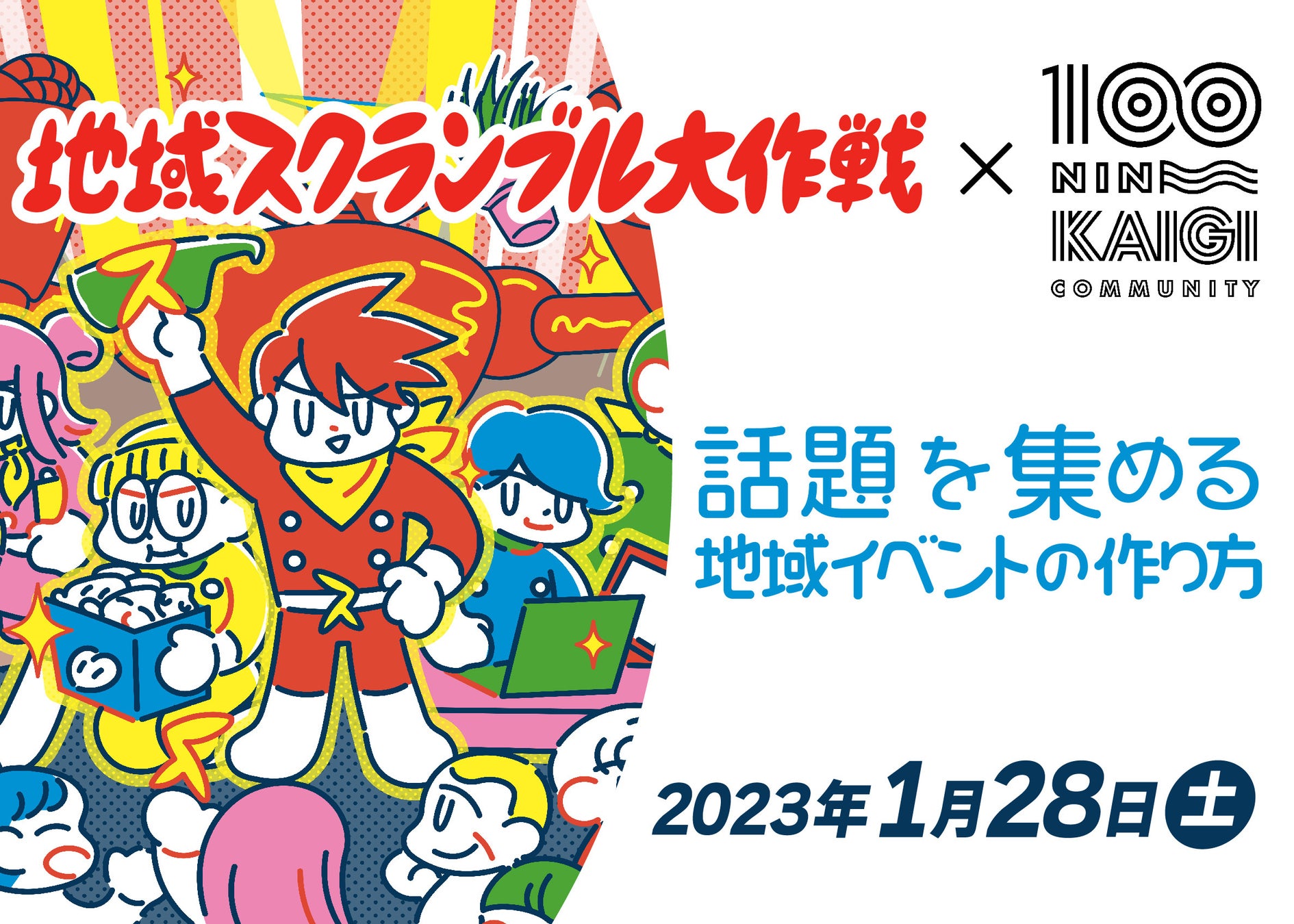 2023年1月28日(土)14:00~、独自の視点で地域活性に取り組むスペシャリストが集結するイベント「地域スクランブル大作戦 」と「100人カイギ」のコラボイベントを実施します。テーマは「話題を集める地域イベントの作り方 」 。