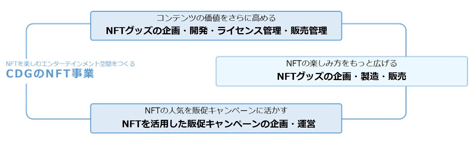 CDGは、ノベルティグッズなどの企画や品質管理および製造における独自のノウハウ、また幅広いライセンスホルダーとのネットワークやライセンス管理、コンテンツ開発における豊富な実績を有しています。これらのノウハウや実績をいかし、今後はNFTの企画や販売、またNFTを活用した販促キャンペーンの企画・運用、さらに関連グッズの開発も積極的に行い、NFT事業をトータルで運用できる仕組みを創ってまいります。そして、NFTを通じて多くの方々が楽しめる、
