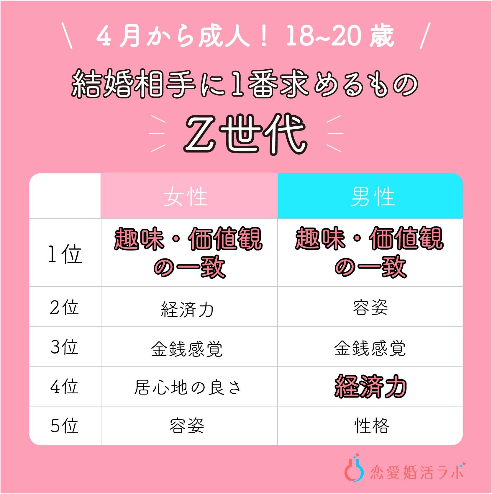 Z世代で、4月から成人の対象となる18-20歳の男女は、「相手に求めるもの」が、金銭面も含めた「フラットな関係性」であり、「趣味や価値観の一致」が大切な条件であることが、一連の調査からわかりました。