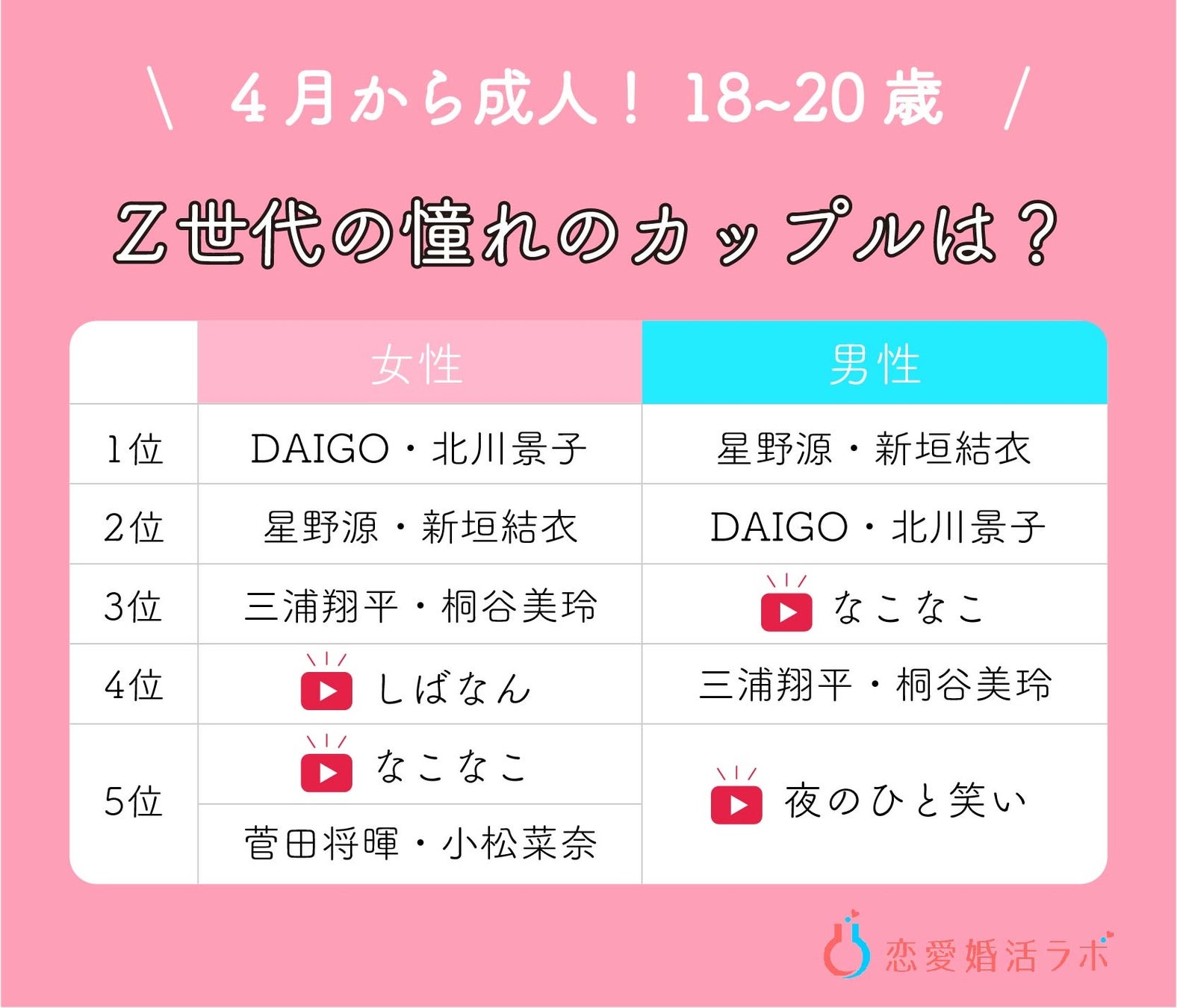 【3】Z世代が最も憧れるカップルは「星野源・新垣結衣」!Youtuberカップル「なこなこ」「しばなん」もランクイン!
