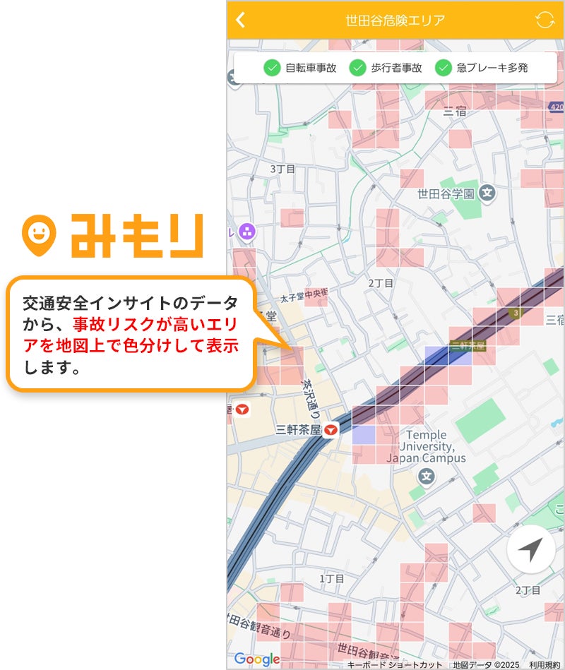 「交通安全インサイト」のデータを活用し、事故リスクが高いエリアを「みもり」アプリ内で色分け表示します。