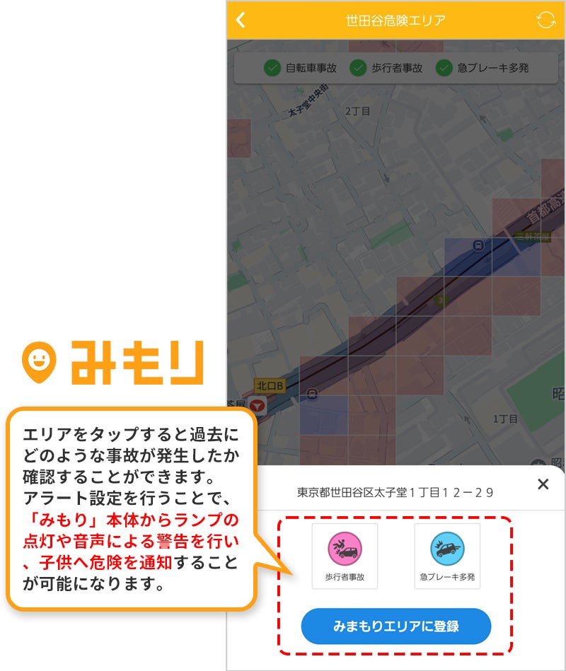 「みもり」専用アプリ内の交通安全インサイトのデータをもとにしたマップから、子供に注意を促したい地点を設定すると、そのエリアに進入した際にランプの点灯や音声による警告を発し、交通安全への意識を高めます。
