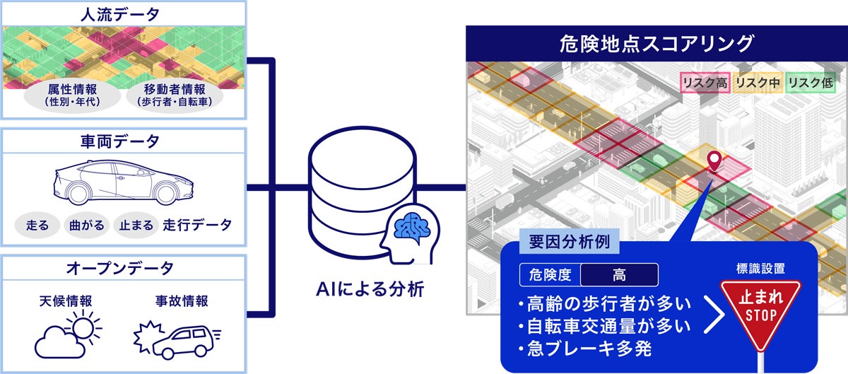 人流や車両のビッグデータ、外部のオープンデータである過去の交通事故統計情報などのデータをAI分析し、危険地点をスコアリングして地図上に可視化します。約50m四方単位で危険度合いを可視化するほか、高齢歩行者・高齢自転車利用者の割合や車両の急ブレーキ発生率など、各地点における危険要因となる特徴を確認できます。これにより道路標識の新設など、データに基づいた効果的な対策をはじめ、さまざまな交通安全業務に活用いただけます。