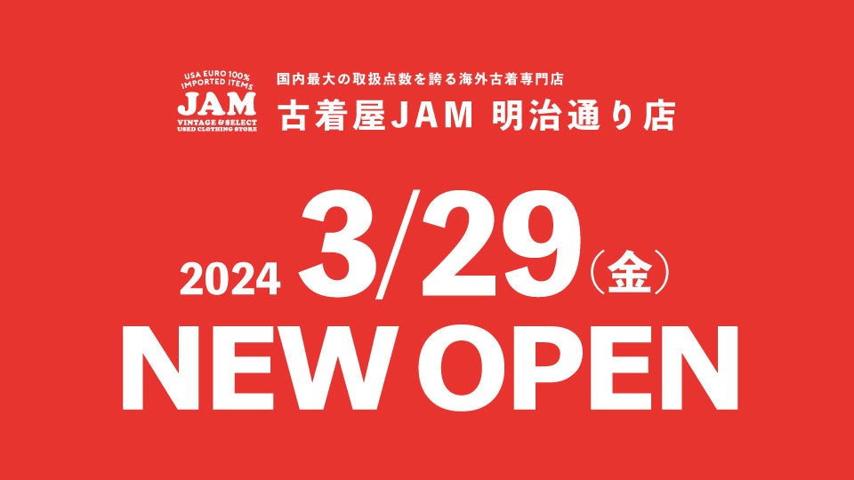 国内最大級の取扱点数を誇る海外古着専門店の「古着屋JAM(ジャム)」が、原宿へ2店舗目となる「古着屋JAM 明治通り店」を2024年3月29日(金)にオープン。
