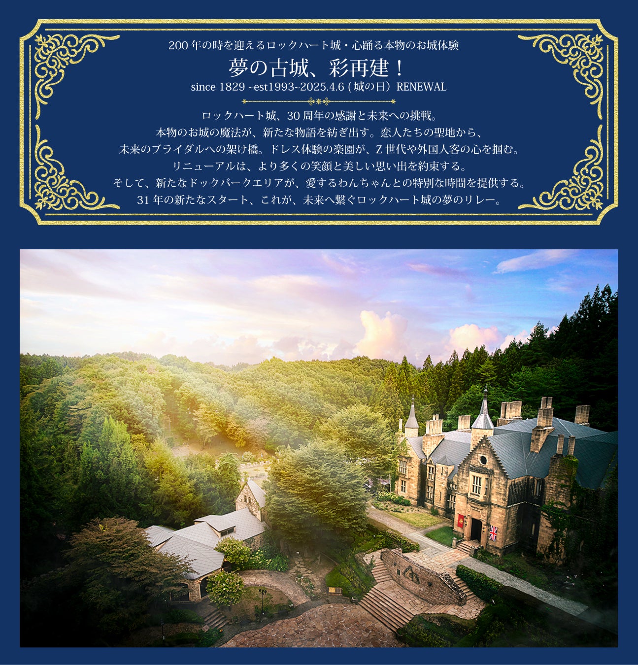 群馬県吾妻郡高山村に日本で唯一移築復元したヨーロッパの古城「ロックハート城」が開設以来初となるグランドリニューアルを迎え、2025年4月6日(城の日)に新たな姿をお披露目いたします。 今回のリニューアルに際し、Re+newという言葉を改め『彩再建』と冠しました。 それは、過去の輝きを敬いながら、新たな彩りを加え、未来へとつなぐ再生のかたち。時の流れとともに深みを増したもの、色合いを変えたものに新たな命を吹き込み、美しさと笑顔が息づく空間へと生まれ変わるロックハート城。 いにしえの風格と新たな輝きが調和するこの場所で皆様をお迎えいたします。