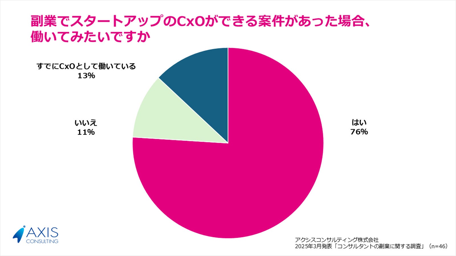 コンサルタントが副業として魅力を感じる内容は「新規事業」(20%)、「CxO」(13%)、「リサーチ・データ分析」(13%)の順位となり、コンサルタントの副業の主戦場はこれらの領域であることがわかりました。また、これらの結果を踏まえ、副業でスタートアップのCxOを経験してみたいか尋ねたところ、「はい」が76%と興味関心が高いことがわかりました。
