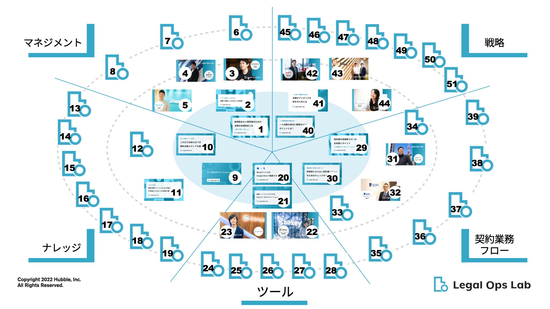 これまで公開してきた記事を、戦略、マネジメント、ナレッジ、ツール、契約業務フローの5分野に分けてマッピングしています。