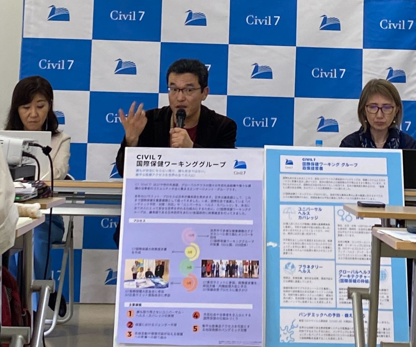 C7では政策提言書を作成するために「核兵器廃絶」「気候・環境正義」「公正な経済への移行」「国際保健」「人道支援と紛争」「しなやかで開かれた社会」の6つのワーキンググループが構成され、72ヵ国(うち54ヵ国はグローバルサウス)から700名以上が参加し、議論しました。今回記者会見では、そのうち「公正な経済への移行」「国際保健」の2つのワーキンググループの代表が参加しました。