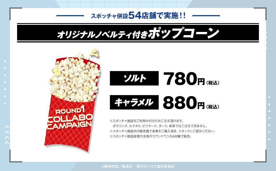 全国のボウリングとカラオケ90店舗でコラボメニューを、スポッチャ併設店舗ではコラボポップコーンを販売いたします。各店舗で販売する対象メニューをご注文いただいたお客様には、コラボメニュー限定ノベルティをプレゼントいたします。
