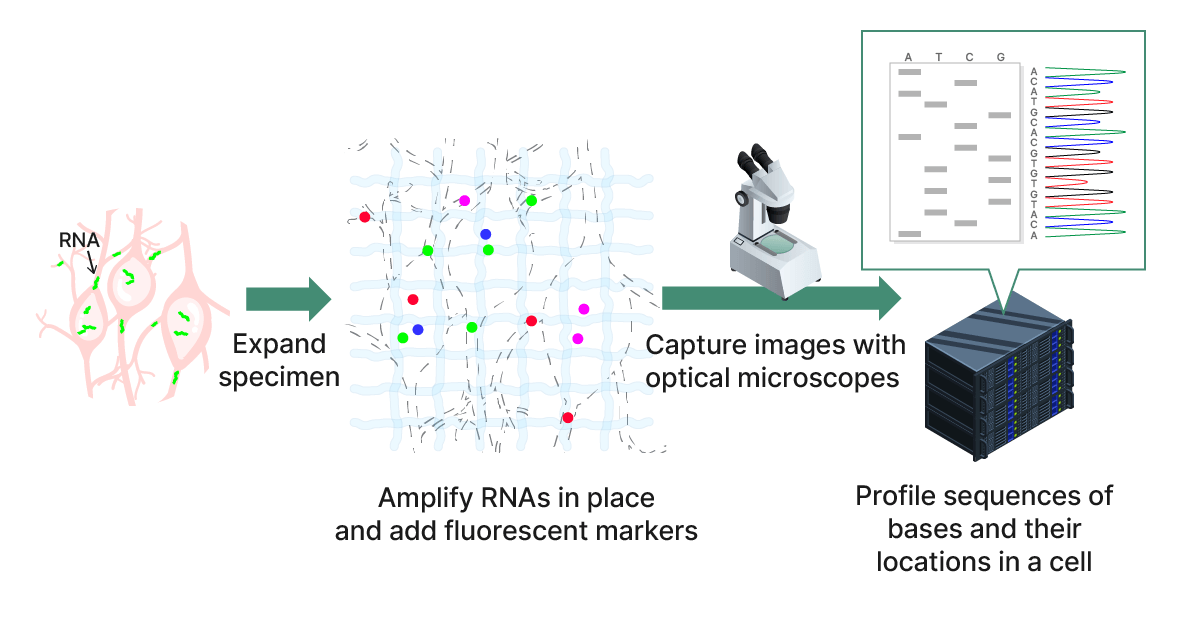 ExSeq法(Expansion Sequencing)をはじめとする、生体内シーケンシング(in situ Sequencing)は、RNA塩基配列とRNAが細胞内にどのように分布しているかを同時に特定する技術で、癌の研究や治療、新薬の開発で注目されています。一方、塩基情報とRNA分布情報(3次元)を同時に解析する必要があり、大量のデータ処理が必要となります。