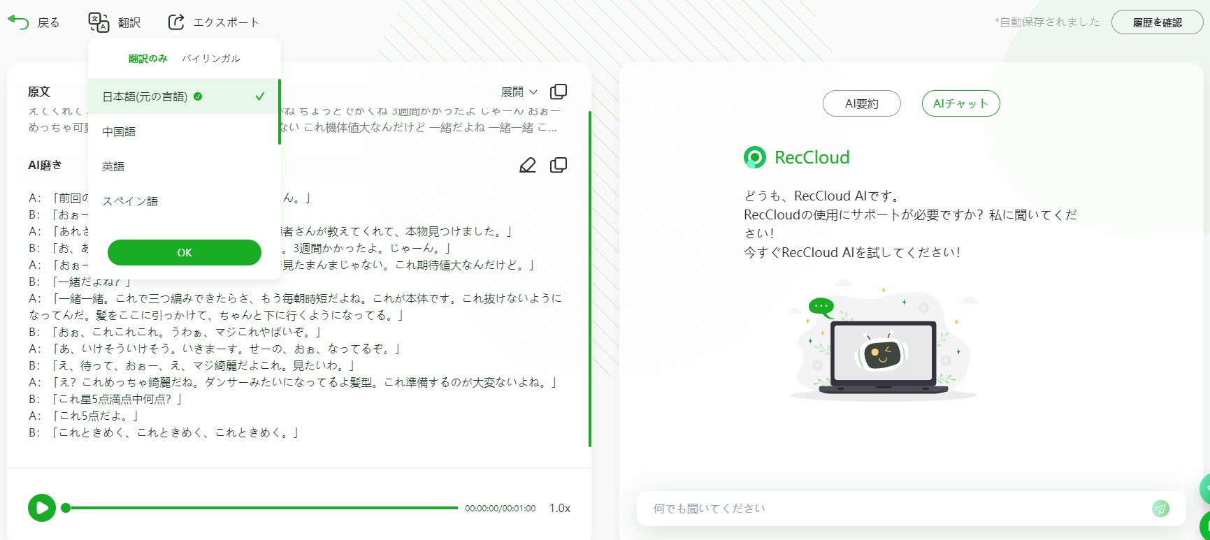 「AI文字起こし」機能の追加により、RecCloudはAI駆動型マルチメディア処理プラットフォームとしての実用性と汎用性をさらに強化し、ユーザー基盤の拡大を目指します。さらに、文字起こし後の自動翻訳機能やAIによる要約機能もユーザーのあついご要望で追加され、今後もユーザーニーズに応じた機能拡張を継続的に行ってまいります。