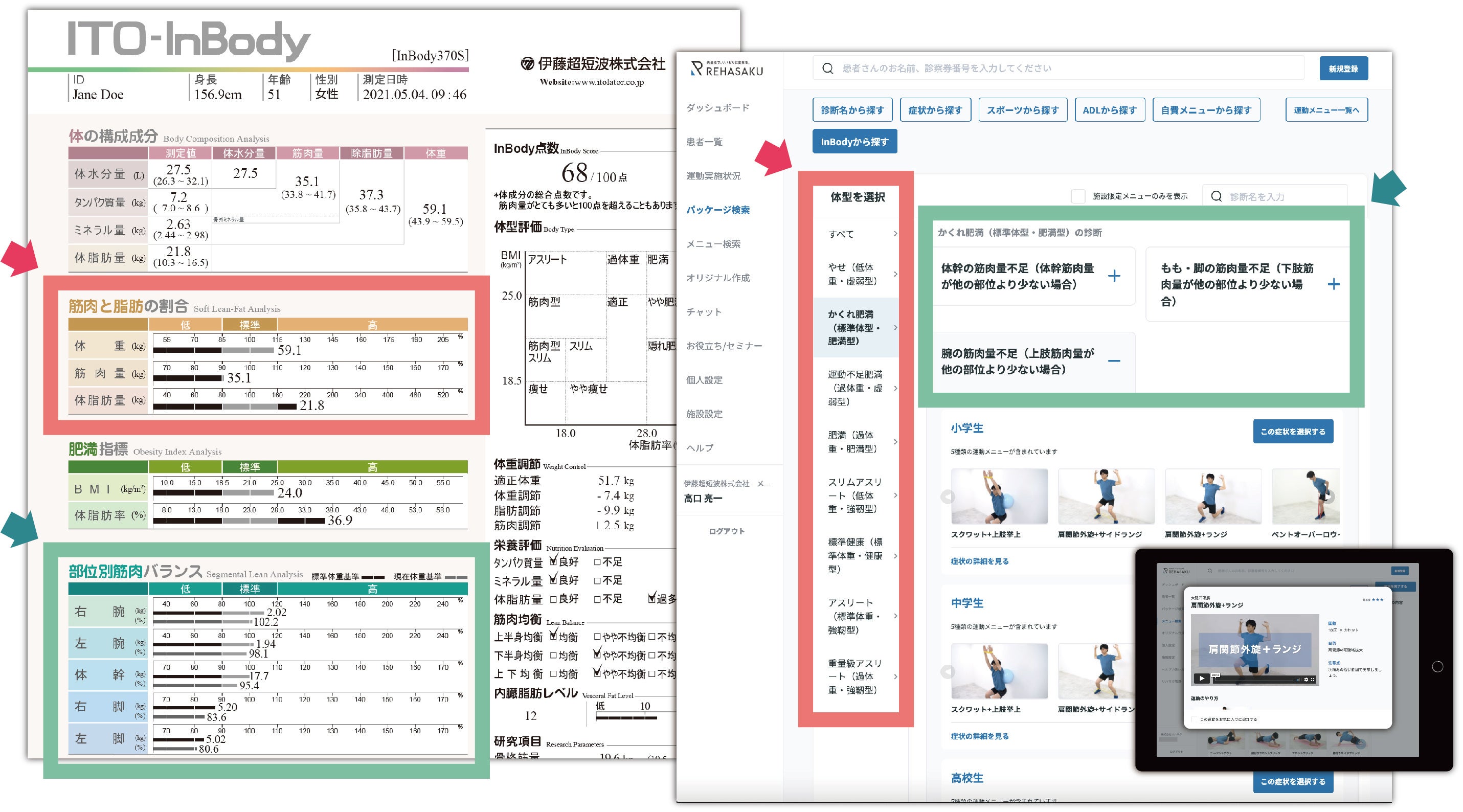 | 高精度体成分分析装置「ITO-InBody」と運動療法クラウドシステム「リハサク」との連携 |