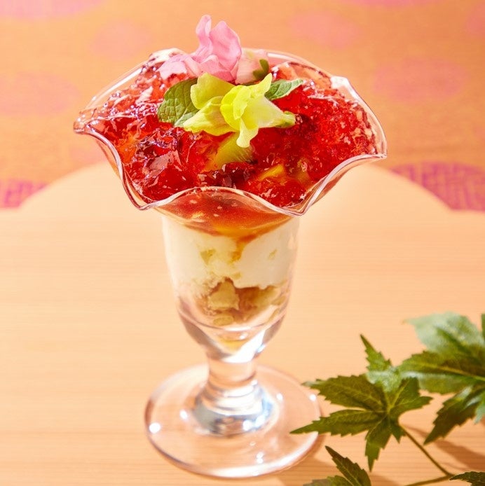 韓国で人気のフルーツを使った夏のスイーツ、花菜(ファチェ)をイメージしたパフェです。ざくろ酢のジュレとマンゴーにレアチーズムースを組み合わせ、さっぱりと仕上げました。
