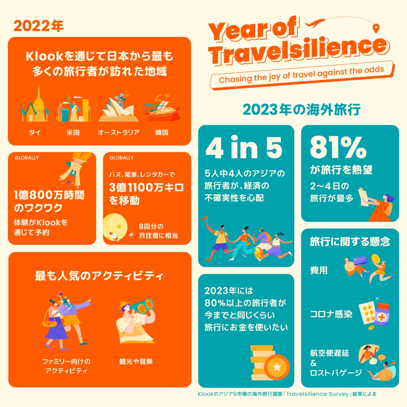 旅行・体験プラットフォームのKlookは、12月13日、アジア9地域で実施した2023年の海外旅行に関するインターネット調査結果を発表しました。それによると、アジアの旅行者の約80%(5人に4人)が来年(2023)の海外旅行について不安を抱いていると回答しました。一方で、80%以上が再び海外旅行へ行くことを熱望しており、3分の1が来年中に2~4回の旅行を計画しているという結果になりました。