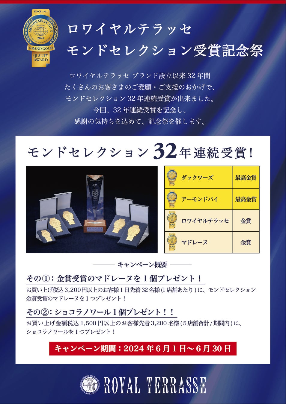 いつも菓匠三全をご愛顧くださるお客様に感謝の気持ちを込めて、「モンドセレクション32年連続受賞 記念祭」を開催いたします。期間中は“32年連続受賞”にちなんだプレゼントをご用意いたします。