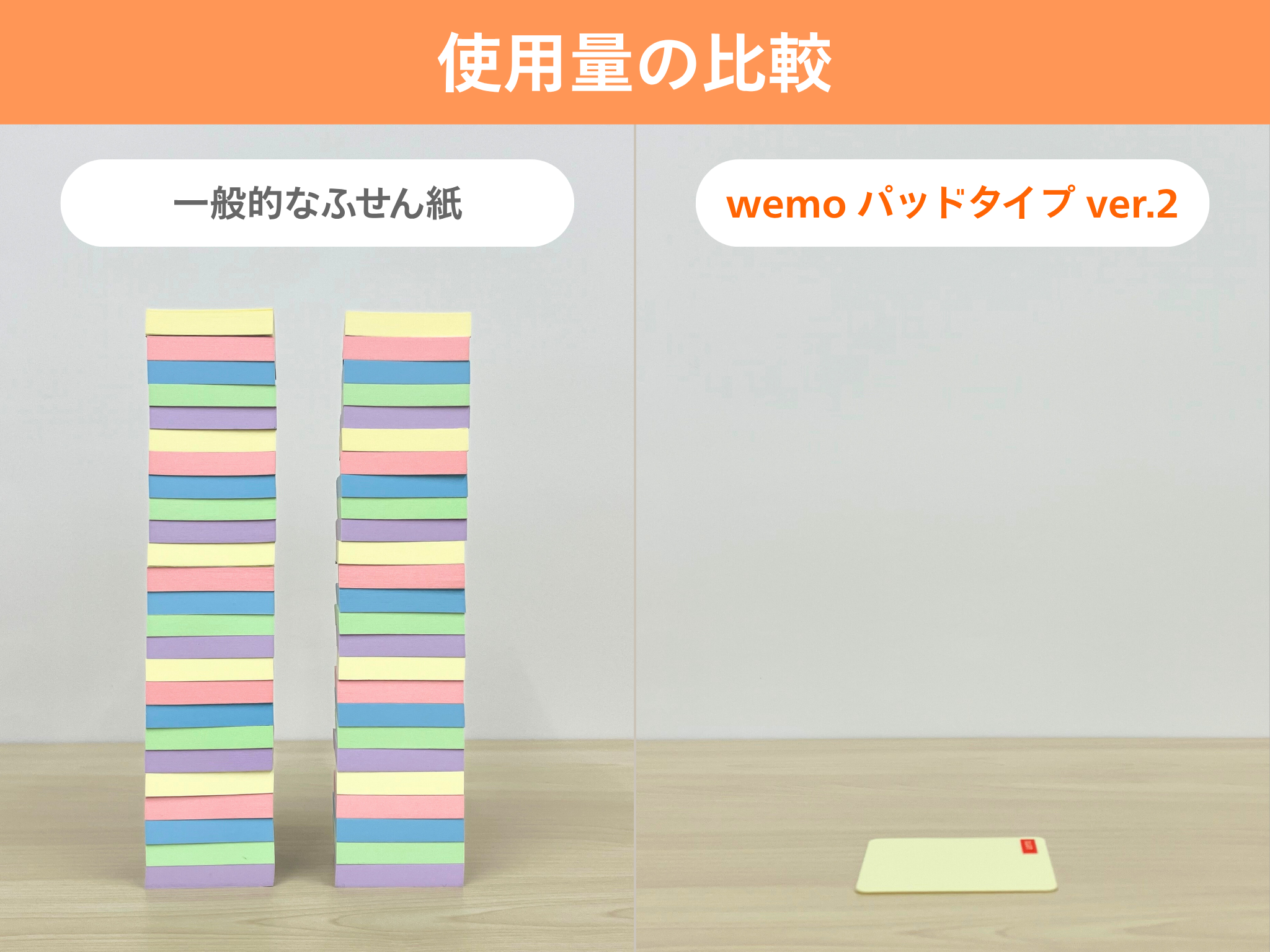 ふせん紙はとっさのメモ書きやリマインダー、伝言ツールとして、特にオフィスにはなくてはならない文具です。毎日使用するという人も多く、1日に大量に消費することも珍しくありません。「wemoパッドタイプ」シリーズは、従来使い捨てる事が前提であった紙製のメモ・ふせんの常識を覆し、半永久的に繰り返し使うことができます。5,000回の使用テストをクリアし、水や折れにも強いため、「繰り返し使えて経済的」「ふせんより長持ちして便利」と言った声も多く寄せられています。1日5回程度使用するとして「wemo パッドタイプ」シリーズはたった1枚で約3年使い続ける事ができます。