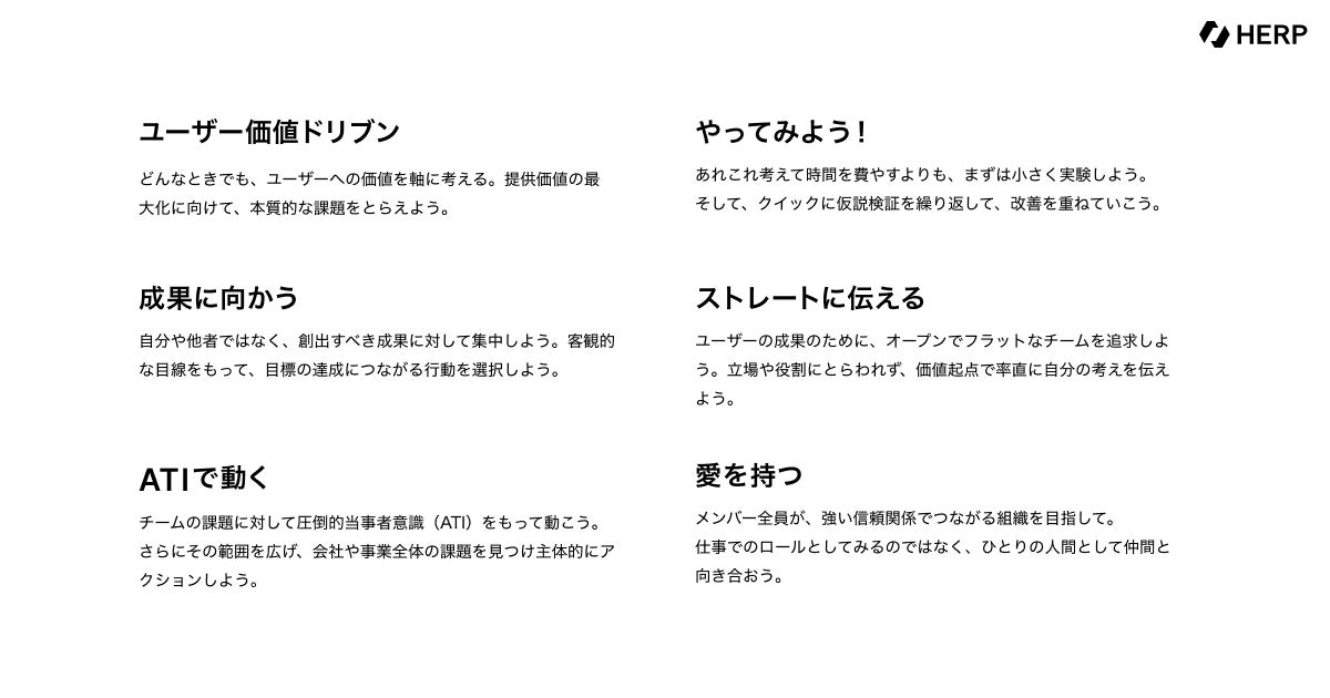 今後HERPでは『HERP Hire』『HERP Nurture』に加え、新たなる『HERP』ブランドのもとHRTech領域での新規サービスの本年中の提供開始を予定しています。新たな事業展開を見据えた組織体制の強化に向けて、一貫性のあるブランドのもとメンバーが一丸となりより自律的に活躍することを通じ、導入企業およびパートナー企業のみなさまをはじめとしたあらゆるステークホルダーの方々との関係性を強化することを目的とし、コーポレートおよびプロダクトのブランドを再定義する運びとなりました。株式会社パークのサポートのもと、2021年9月にミッションを「採用を変え、日本を強く。」に再定義し、同年12月に6つのバリューを策定しました。