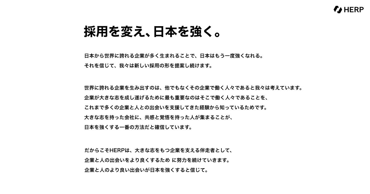 ミッションには"サイズ感"が重要だと常々思っています。背負うものが大きいほど、ワクワクする。でも大きすぎると絵空事のようでピンとこない。今回のHERPさんのミッションでも、適正かつMAXサイズなバランスを探っていきました。ヒアリングの中で多くの方が熱く語っていた「採用の変化の先にある日本企業の成長に寄与したい」。そんな想いを受けて言語化した『採用を変え、日本を強く。』この覚悟が、これからますます実を結んでいくことを願っています。