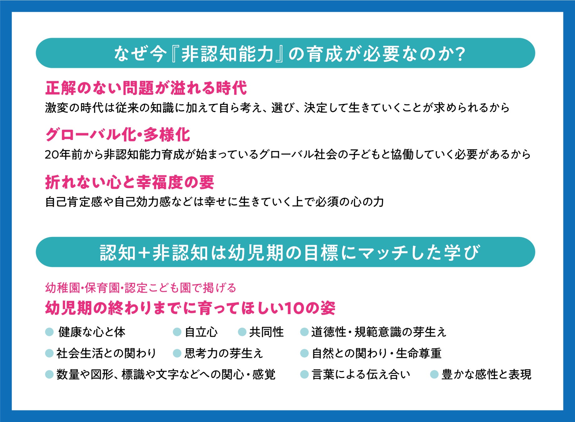 非認知能力はIQ(知能指数)や偏差値、点数など数値化できる認知能力とは真逆の数値化できない能力で、自己肯定感・自己効力感・自制心・主体性・柔軟性・やり抜く力・回復力・想像力・創造力・共感力・協働力・社会性などが含まれます。「人生の幸せと成功に大きく寄与する」とされており、非認知能力は0歳から10歳が最も効果的に育まれる時期と言われています。