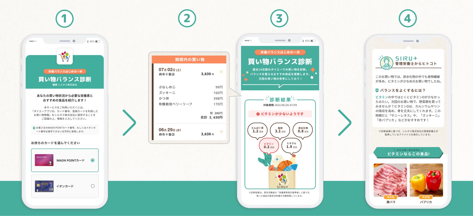 (2)2週間分の買い物履歴をもとに栄養バランスを診断します (※3)