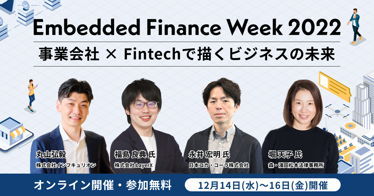 株式会社インフキュリオン(本社:東京都千代田区、代表取締役社長:丸山 弘毅、以下「インフキュリオン」)は、Embedded Finance(エンベデッドファイナンス)をテーマにした無料ウェビナー「Embedded Finance Week 2022」を2022年12月14日(水)〜12月16日(金)の3日間開催、合計10講演をライブ配信いたします。