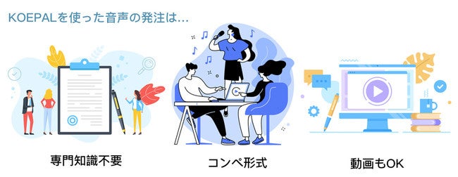 「KOEPAL(コエパル)」は、音声PRや社内マニュアル・説明書の音声化、3分程度の動画に対しての音声をを最短3分で発注できるサービスです。リリース当初は1つの発注に対して3名〜5名程度のKOEPAL認定の声優・ナレーターが発注に基づいた音声を、3営業日以内に発注者に提供。発注者は好みに合った音声を決定し、入手するサービスとなります。