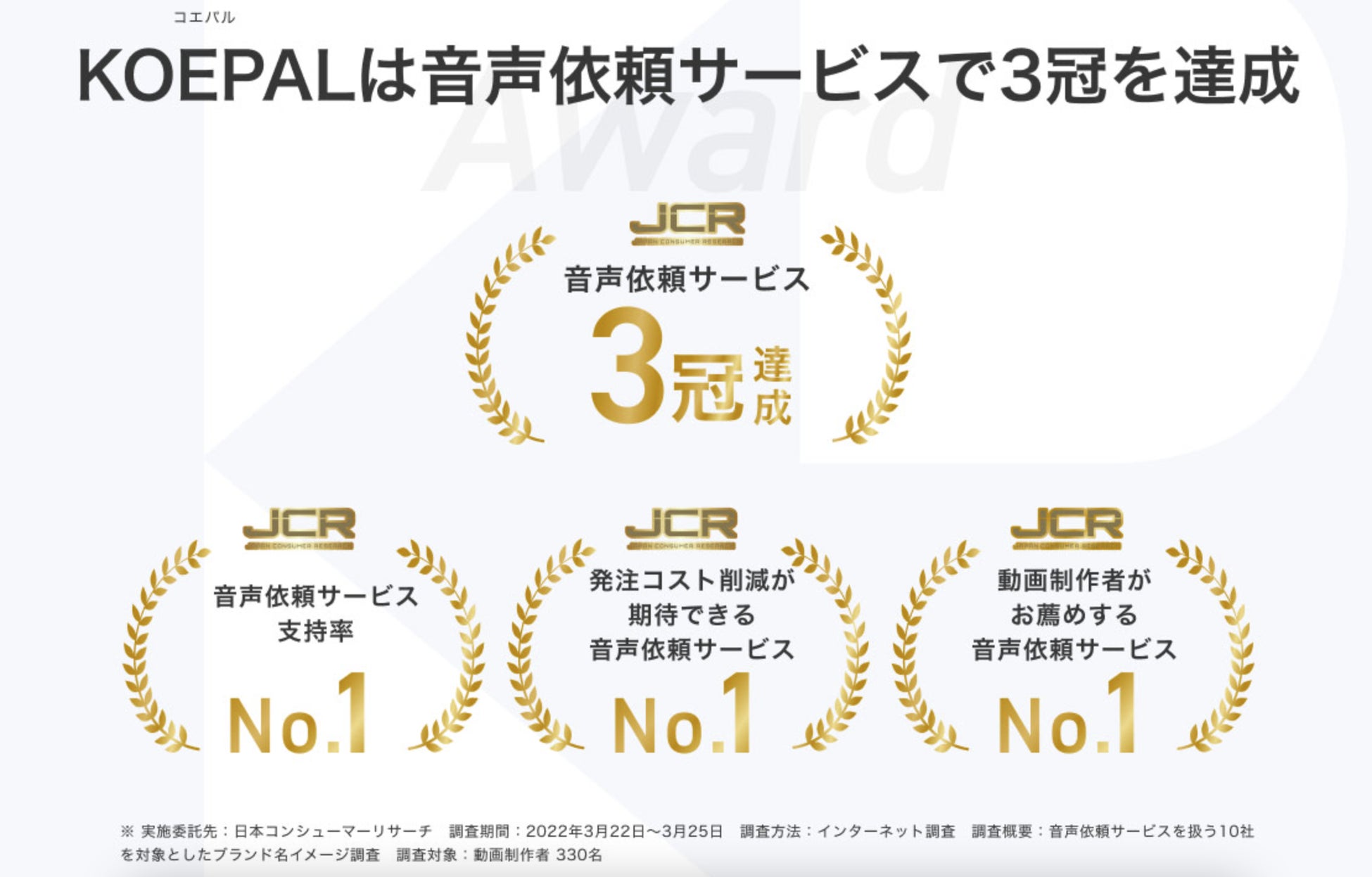 「KOEPAL(コエパル)」が動画制作者が選ぶ 音声依頼サービス No.1を獲得。三冠記念で50%OFFキャンペーン延長!